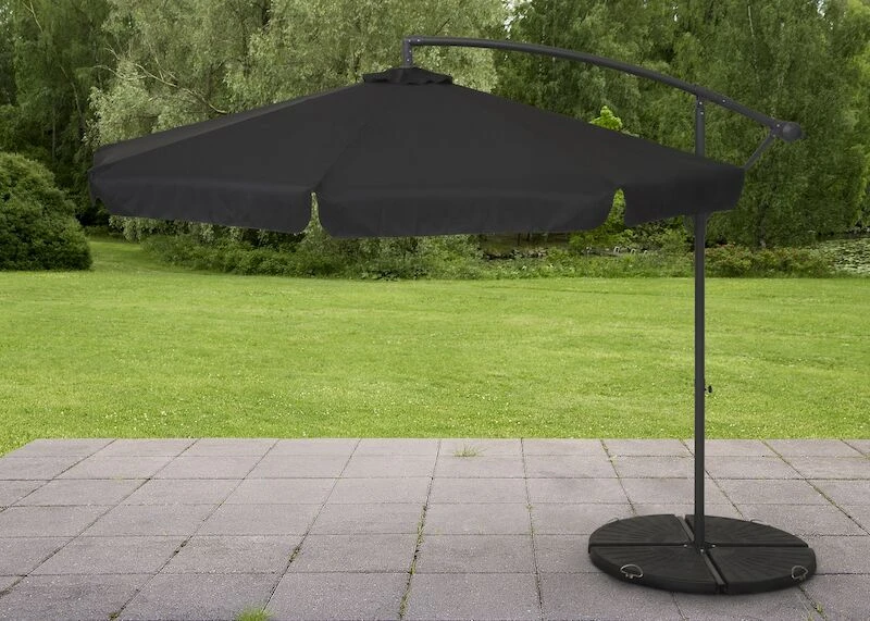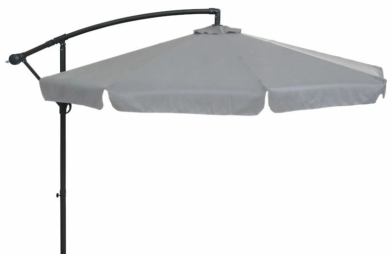 4Living Banana aurinkovarjo veivimekanismillla. Varjo avataan ja suljetaan veivimekanismilla. Varjon halkaisija on avattuna 3 m. Korkeus säädettävissä, maksimikorkeus 245 cm. Pulverimaalattu 48 mm teräsrunko ja puomivarsi 42 mm teräsputkea. Varjo-osassa on kuusi terästankoa, jotka tukevat varjon kangasta. Varjon päällinen on polyesterikangasta, jonka vahvuus on 160g/m2. Teräsristikkojalustaan saa lisättyä neljä painoa. Painot ristikkojalkaan myydään erikseen.