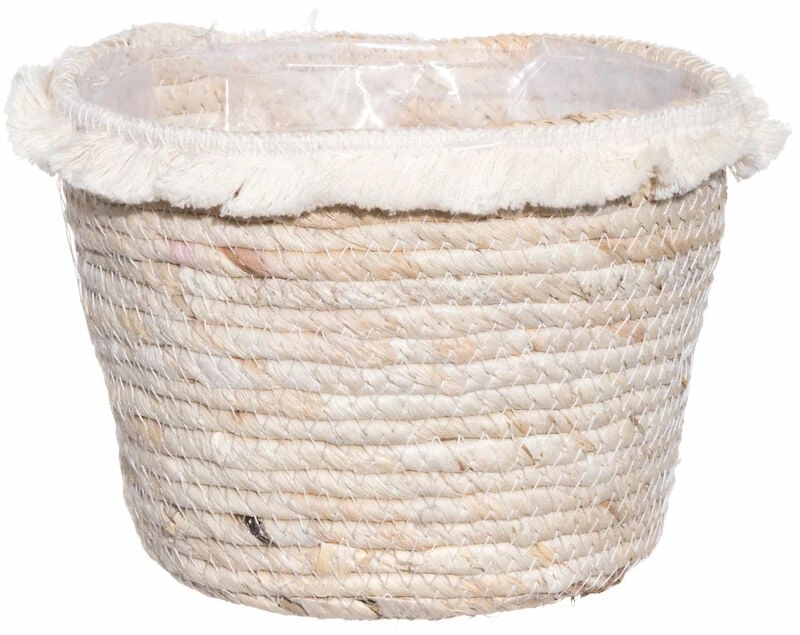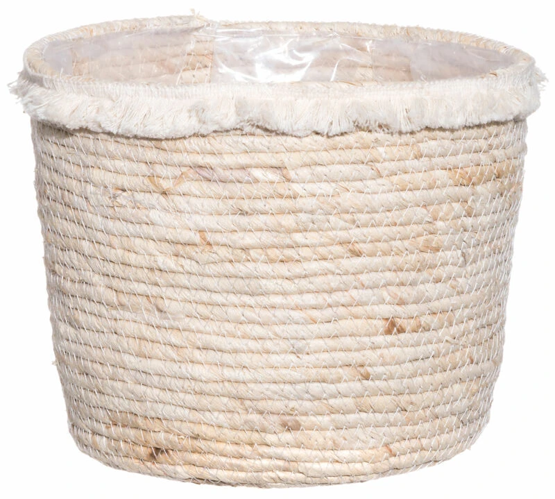 Ihastuttava 4Living Linda suojaruukku hapsuilla. Kaunis luonnonväri. Valmistettu maissista. Muovitettu sisältä. Reunusta kiertää luonnonvalkoinen hapsutus. Ruukkua voi käyttää sisä- ja ulkotiloissa, mutta sen tulee olla talvella kuiva ja tyhjä, jotta se ei halkea.