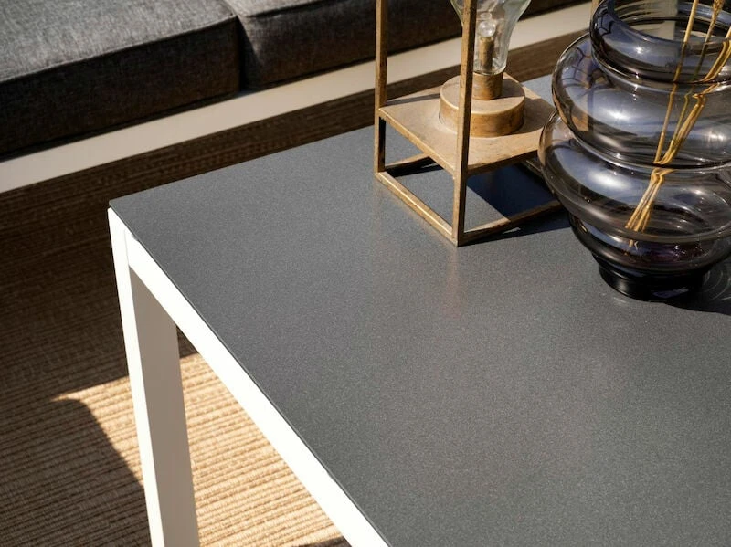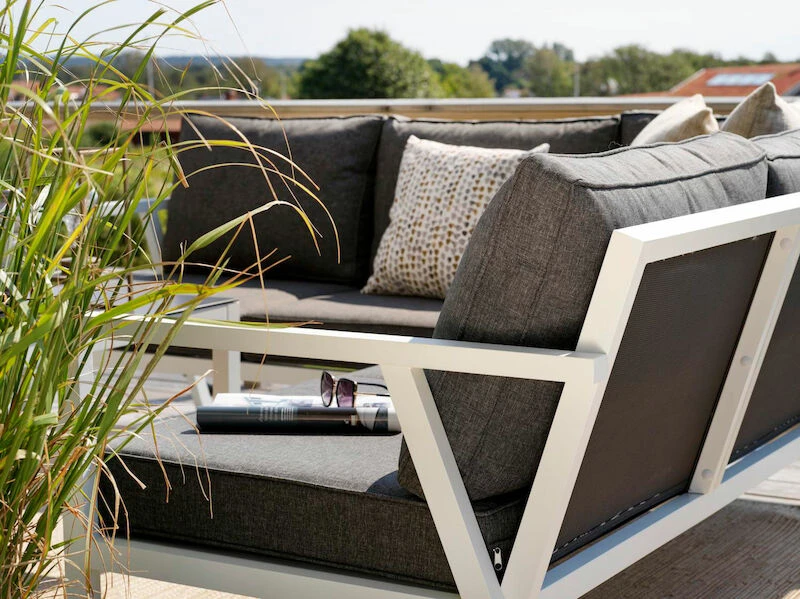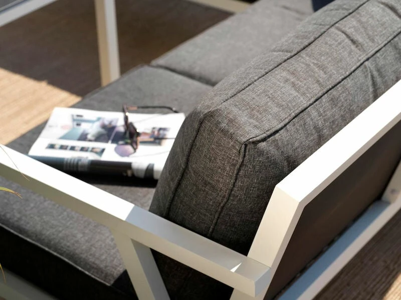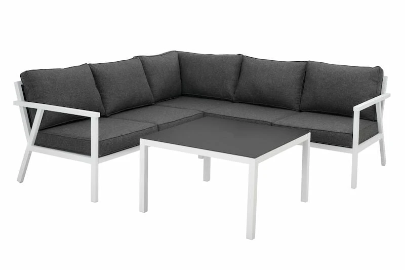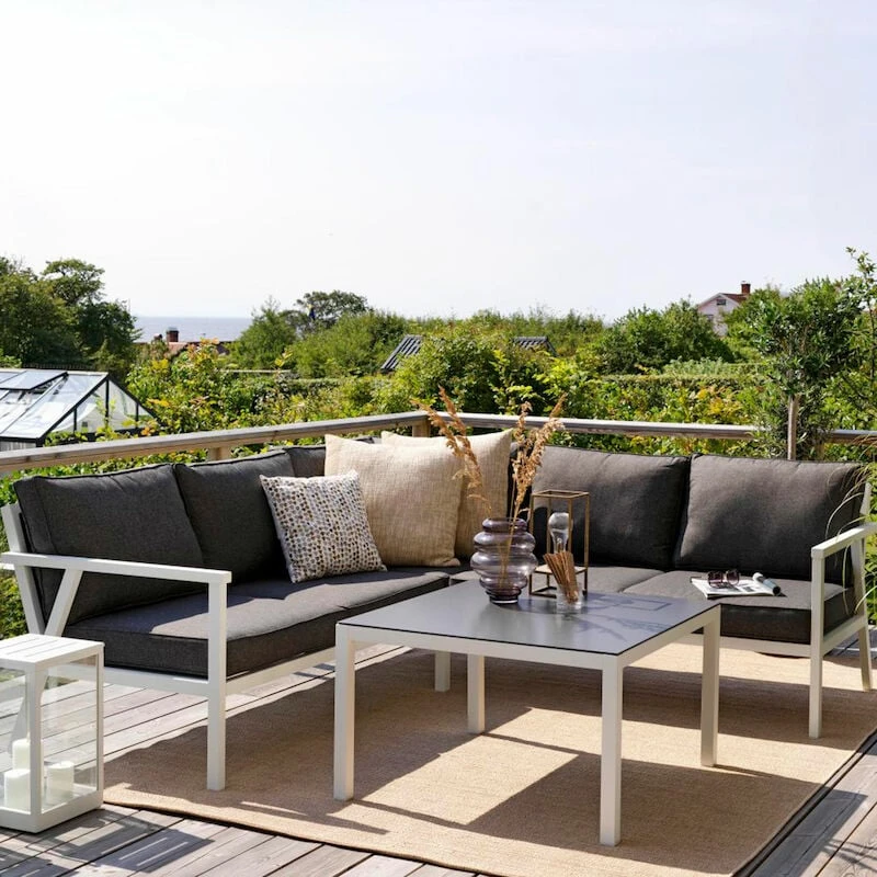 Tyylikäs alumiinirunkoinen Brafab Rana kulmasohva ja sohvapöytä on suunniteltu moderniin ja rentoon tyyliin, kestävyys edellä huomioiden pohjoismaiden vaihtelevat sääolosuhteet. Pehmusteet on verhoiltu Olefin-kankaalla, joka on kulutusta ja uv-säteitä kestävää, helposti puhdistettavaa ja nopeasti kuivuvaa materiaalia. Sohvapöydän kansi on säätä ja kulutusta kestävää ruiskumaalattua lasia. Muoviset yksityiskohdat sopivat rungon väriin – mustat yksityiskohdat mustissa tuotteissa ja valkoiset yksityiskohdat valkoisissa tuotteissa.