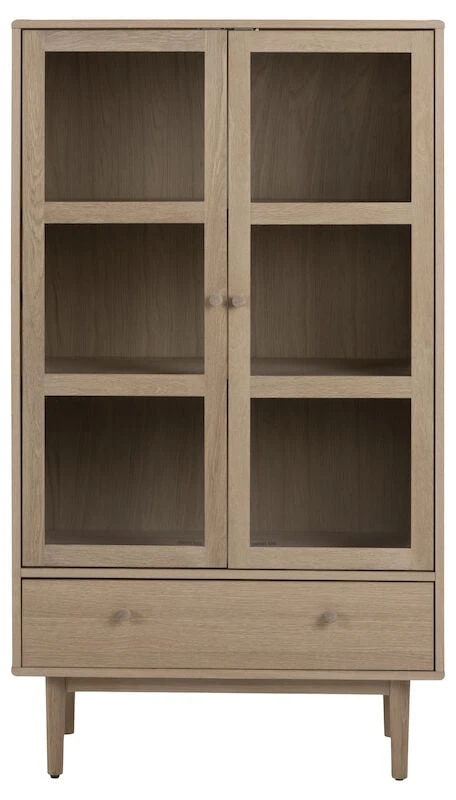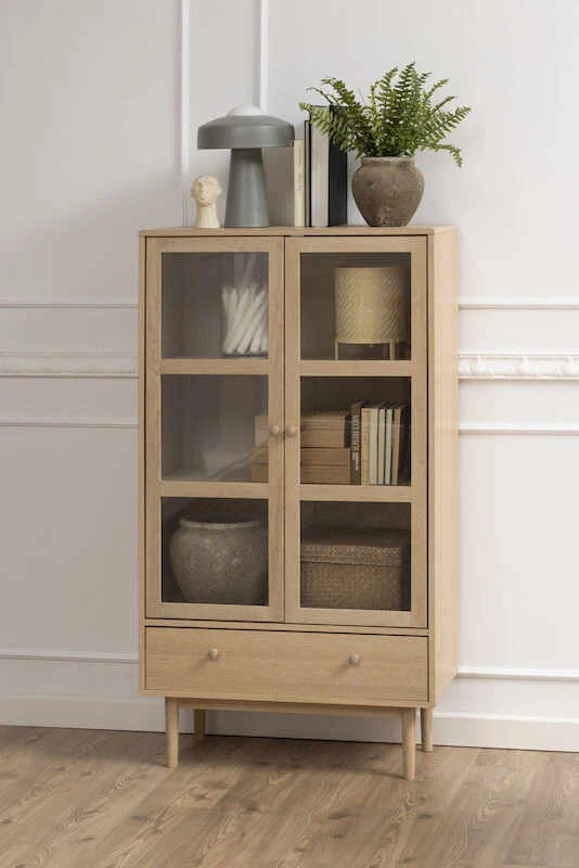 Tyylikäs massiivitammesta ja tammiviilusta valmistettu Aston vitriini sopii täydellisesti kauniiden kodintavaroiden ja astioiden säilytyspaikaksi. Selkeä muotokieli sopii skandinaaviseen sisustustyyliin ja kaunis valkoöljytty tammensävy luo kodikkuutta. Lasiovien takana on kaksi säädettävää hyllyä ja vitriinin alaosassa on tilava, tasaisesti metallikiskoilla liukuva vetolaatikko. Ovissa on kirkas, karkaistu lasi. Vitriinin jalkaosa on valkoöljyttyä massiivitammea, runko tammiviilutetttua kalustelevyä.