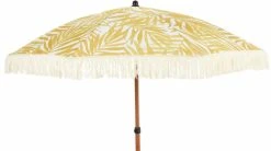 Ihastuttava hapsuilla varustettu aurinkovarjo tuo väriä hellepäiviin. Varjokangas on polyesteriä, jossa on kaunis keltainen lehtikuvio sekä 12 cm pitkät vaaleat hapsut. Varsiosa on metallia, jossa puupintaa jäljittelevä kuvio. Varressa ei kallistusmahdollisuutta. Mukana samasta kuosista tehty säilytyspussi kantokahvalla eli varjo on helppo napaa vaikka rannalle mukaan!