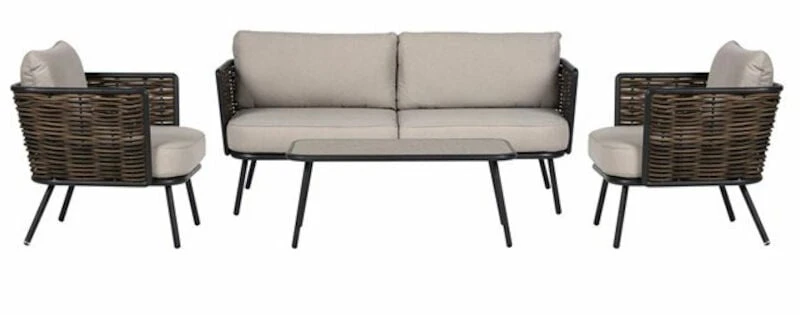 Tyylikäs Envy Diana sohvaryhmä koostuu kahdesta nojatuolista ja sohvasta sekä sohvapöydästä. Sohvapöydässä on spraystone-kansi, joka on sekoitus jauhettua luonnonkiveä ja korkealaatuista hartsia ruiskutettuna lasilevylle. Lasikannen pinta näyttää siis kiveltä. Sohvaryhmän mustaksi maalattu runko on kestävää alumiinia ja helppohoitoista polyrottinkia. Polyrottinkipunoksessa on kaunis, hieman eläväinen pinta. Korkeat käsinojat tuovat ryhdikkään ilmeen ja vaaleat, hiekan sävyiset pehmusteet raikastavat kokonaisuuden. Pehmusteiden päälliset ovat polyesteriä ja ne on suositeltavaa suojata sateelta.