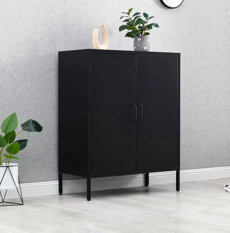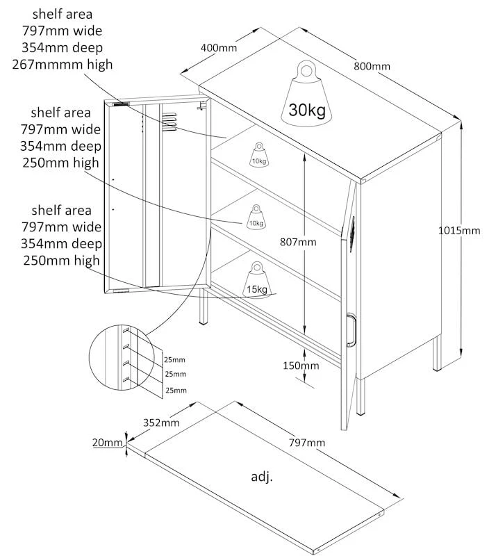 Carbon kaappi on 105 cm korkea ja vain 80 cm leveä. Se sopii täydellisesti esim. olohuoneeseen tai eteiseen sekä ehdottomasti lastenhuoneeseen leluille. Kaappi on tukeva metallista valmistettu ja siinä on säädettävät jalat. Kaapin sisällä on kaksi säädettävää välihyllyä.