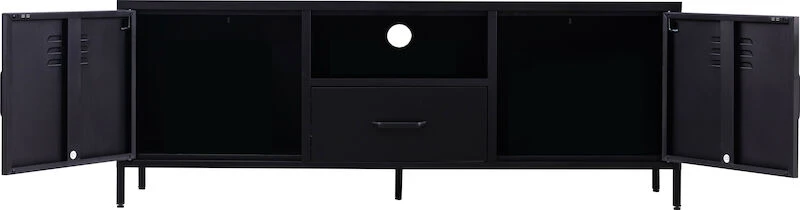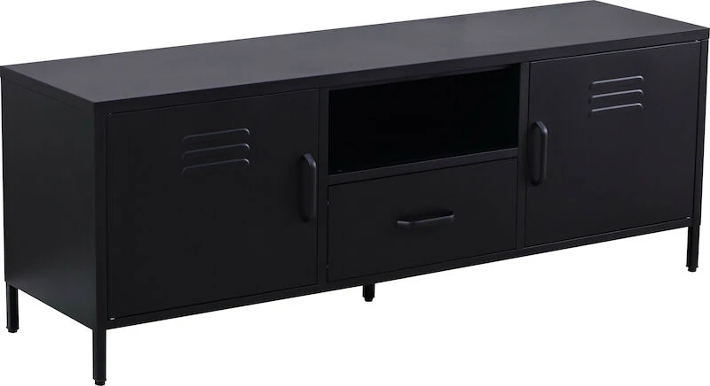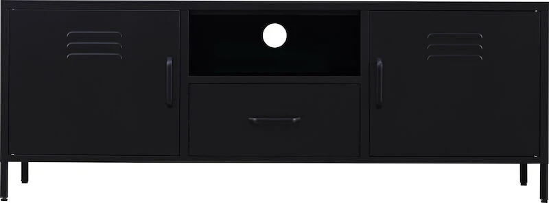 Carbon tv-taso on 150 cm leveä ja siinä on runsaasti säilytystilaa esim. peleille. Tv-taso on valmistettu metallista ja on tukeva, tyyliltään todella moderni. Tasossa on kaapit, tilava vetolaatikko ja lisäksi vielä avohylly. Vetimet ovat metallia. Tv-tason jalat ovat säädettävät.