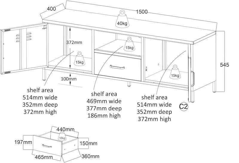 15 kg/hylly, 15 kg/kaappi, 10kg/vetolaatikko, 40kg/kansi
