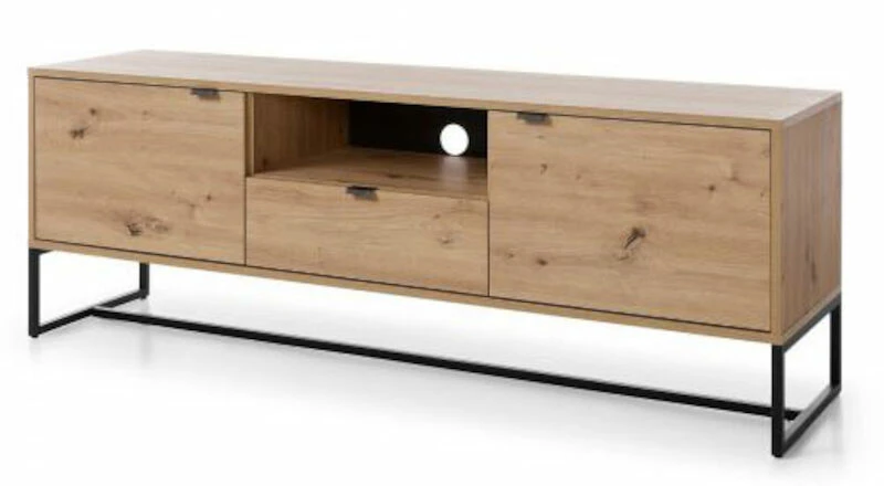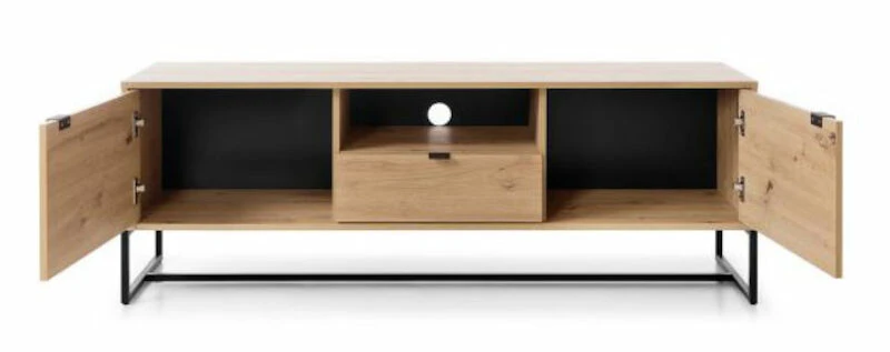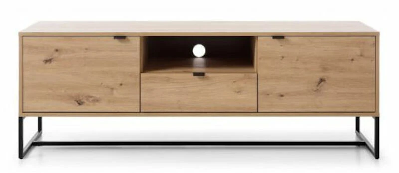 Fore tv-taso tammenvärisenä tuo lämmintä tunnelmaa kodin sisustukseen. Musta metallijalka ja mustat vetimet viimeistelevät tyylikkään tv-tason. Tv-tasossa on 16mm paksu laminoitu kalustelevyrunko. Fore tv-tasosta löytyy kaksi kaappia, yksi avohylly ja vetolaatikko.