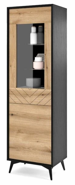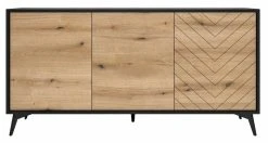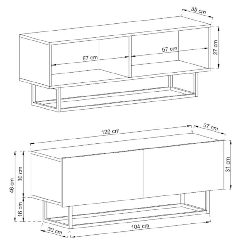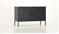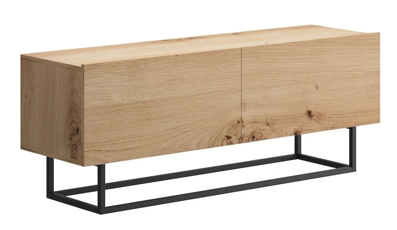 Ihastuttavan selkeälinjainen Jalo tv-taso mustalla metallisella jalkaosalla. Tasossa on helppokäyttöiset kippiovet, joiden takana on hyvin säilytystilaa.
