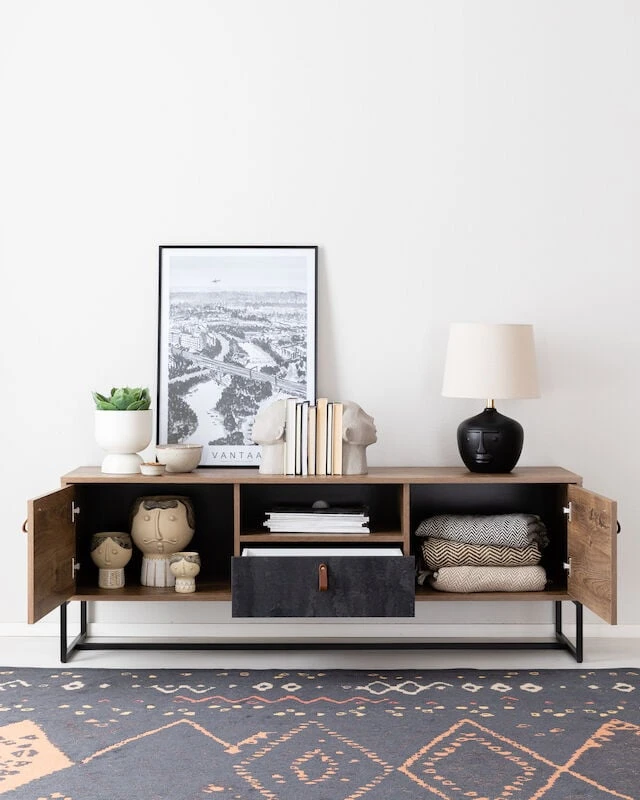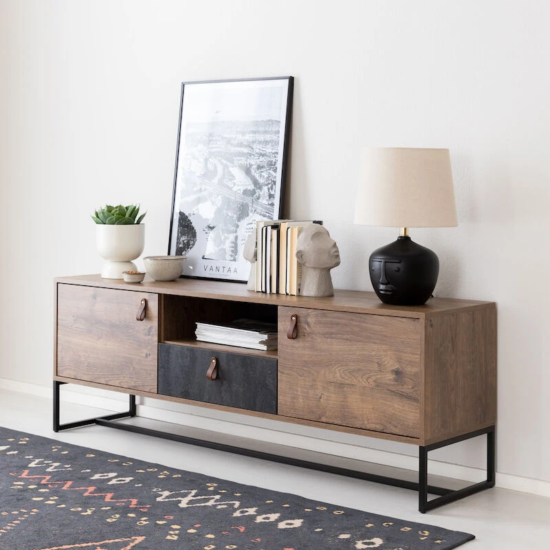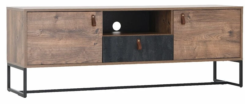 Trendikäs ja tyylikäs Kero tv-taso, 16mm laminoitu kalustelevyrunko. Harmaa kaapin etusarja antaa hienon kontrastin tammenväriseen runkoon ja ruskeat nahkavetimet viimeistelevät kokonaisuuden. Musta metallinen jalkaosa keventää ilmettä, korkeus 18 cm. Tv-taso sisältää kaksi kaappia, vetolaatikon ja avohyllyn.
