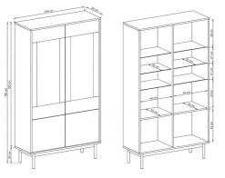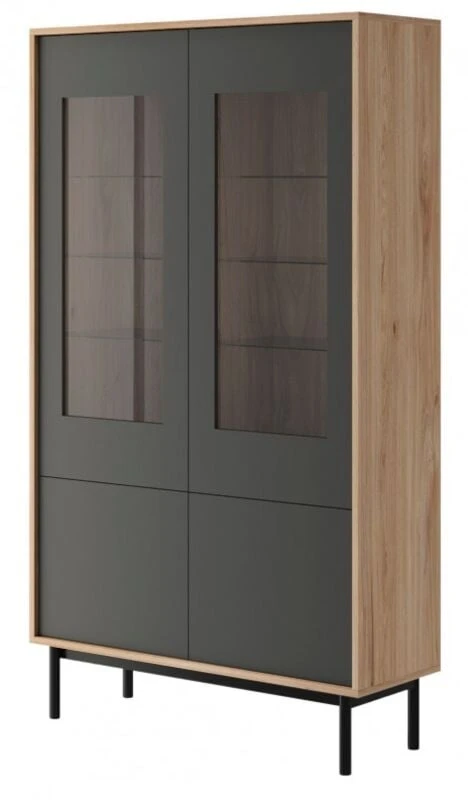Tyylikäs Skandinaaviseen sisustukseen sopiva puujalallinen Milo vitriini. Käytännöllinen ja kaunis mihin tahansa kodin tilaan, sisällä hyvin säilytystilaa. Vitriinissä tammen värinen 18mm laminoitu kalustelevyrunko. Harmaa kaapin etusarja antaa hienon kontrastin tammenväriseen runkoon. Mustaksi maalatut puujalat keventää ilmettä, korkeus 20 cm. Vitriinin yläosassa kaksi karkaistua lasiovea, jonka takana väliseinän molemmin puolin kolme lasihyllyä. Alaosassa väliseinänä molemmin puolin hyllyt. Ovissa push-to-open-mekanismi. , Lasihyllyn kantavuus 2kg/hylly, alaosankaapin hyllyn kantavuus 3kg/hylly ja alahylly 6kg.