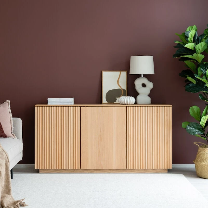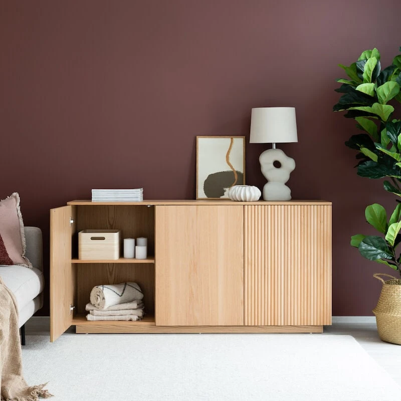 Kaunis luonnonvärinen senkki sisältää reilusti säilytystilaa. Senkissä on kolme tilavaa kaappia, ovissa on ponnahdussaranat. Kaapeissa on hyllyt, joiden korkeutta voi säätää. Senkin runko on mdf-levyä ja tammiviilua. Reunimmiaset ovet on koristeltu pyökkirimoilla.