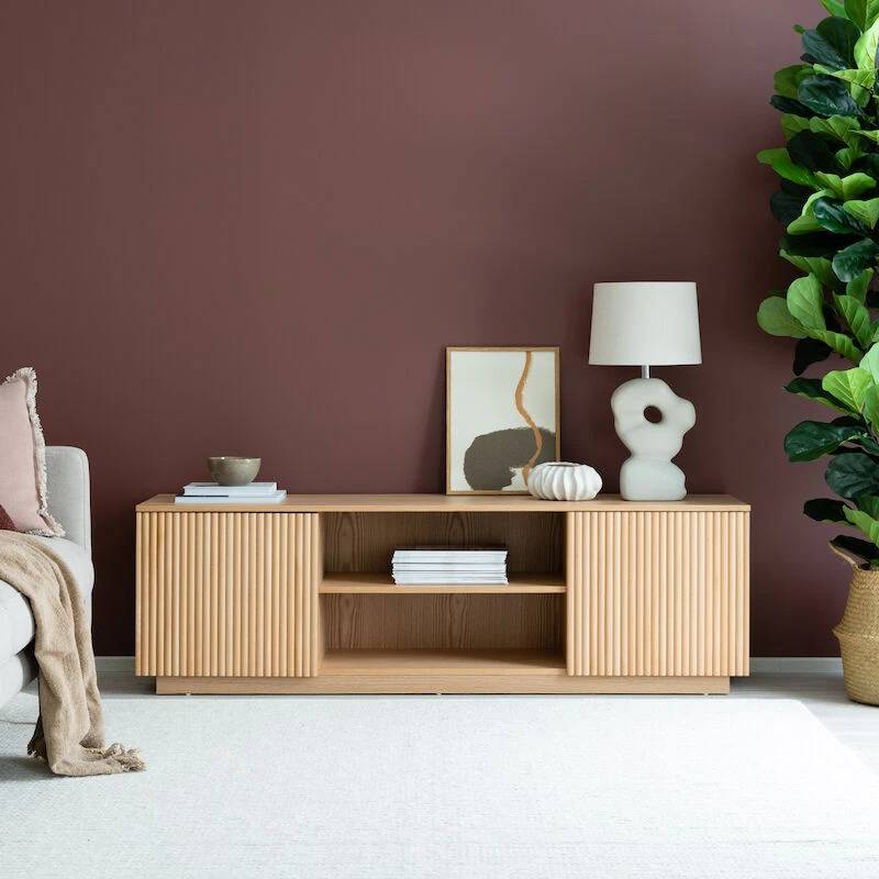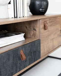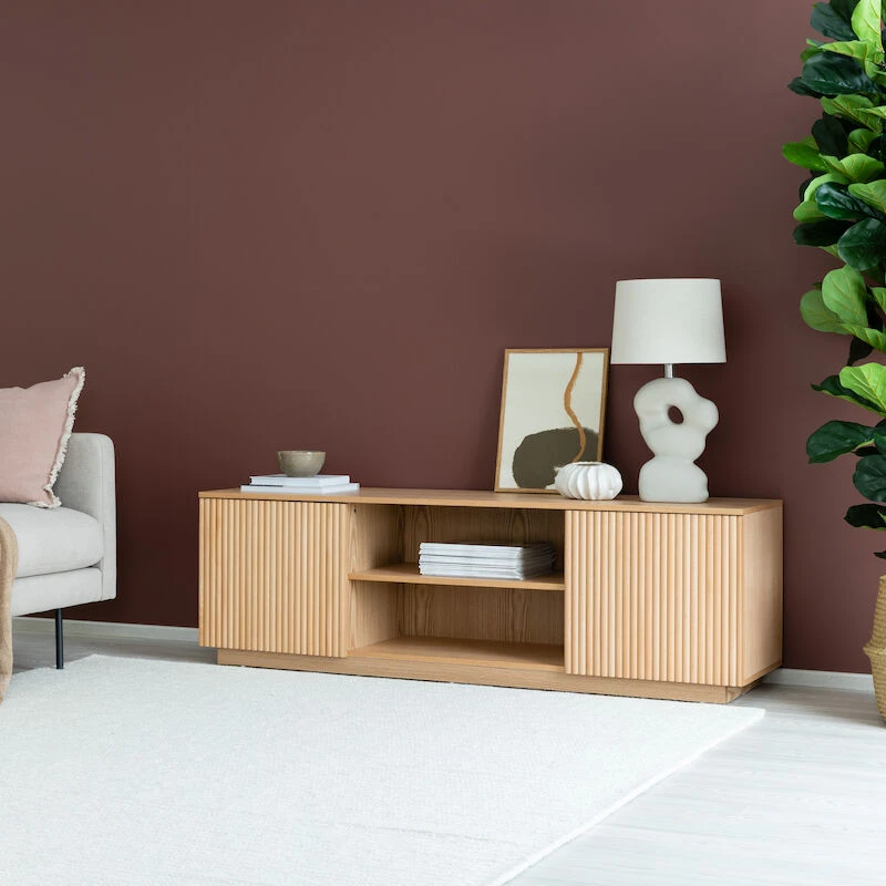 kuuluvan tyylikkään tv-tason ovia koristaa kauniit pyökkirimat. Puunsävy ja orgaaniset muodot tuovat lämpöä ja kodikkuutta sisutukseen, olipa oma tyyli sitten rohkean värikäs taikka hieman hillitypi. Tv-tason keskellä on avohyllyt ja reunoilla kaapit. Runko on mdf-levyä ja tammiviilua. Hyllyjen keskellä on paikka johtojen läpiviennille.