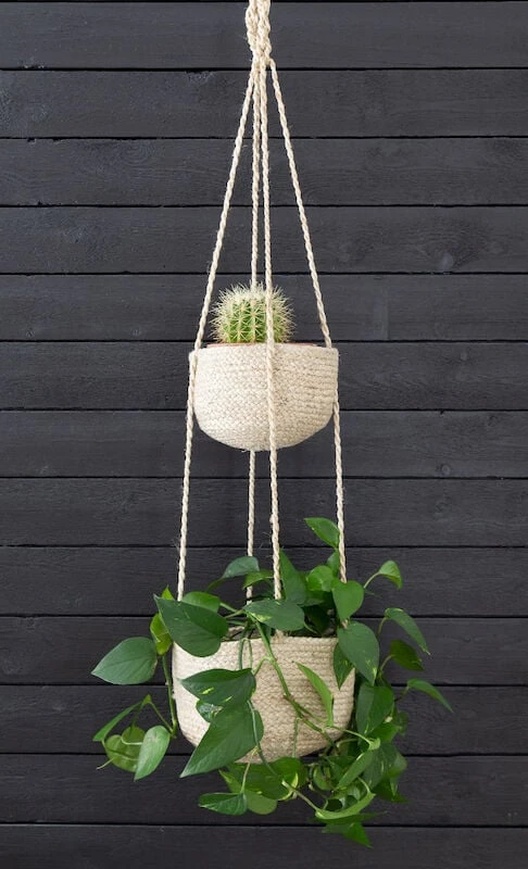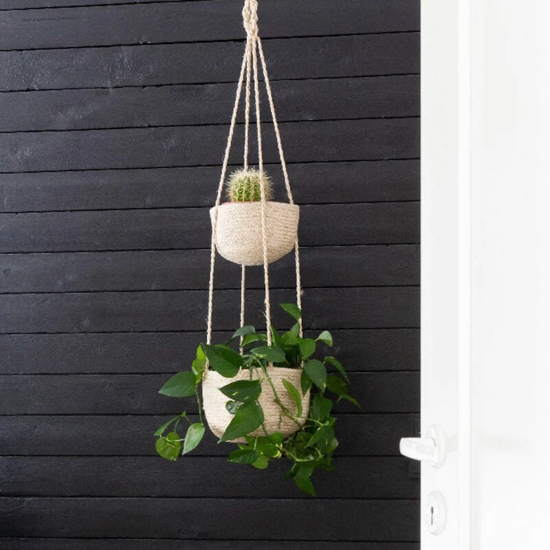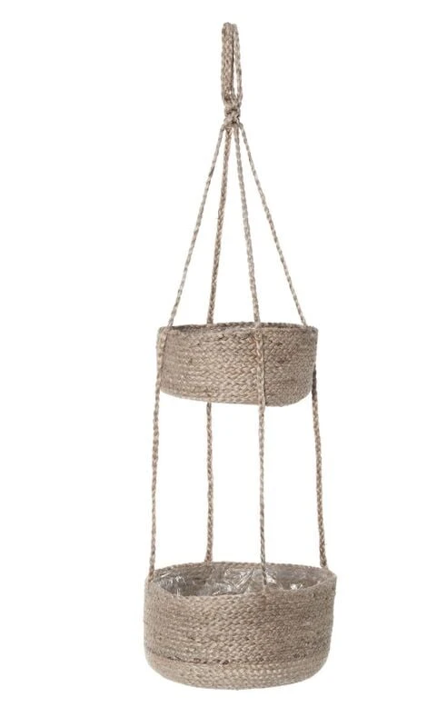 Kodikas Fanni K amppelikori Rauha kukille ja viherkasveille. Amppelikoriin saa kaksi kukkaa lähelle toisiaan, mikä takaa ihastuttavan ja tiiviin väriloiston. Juutti amppelikori mukailee luonnon tunnelmaa ja tuo kukkien ja kasvien värit kauniisti esille. Kokonaispituus: 100 cm. Korit: 25x25x15 cm, 20x20x12 cm.