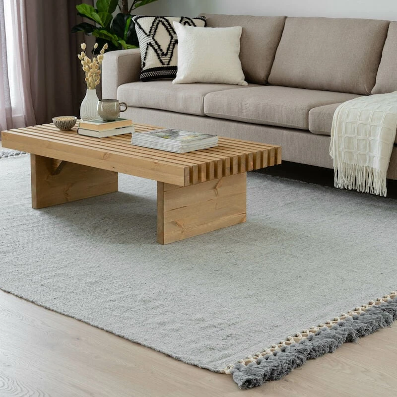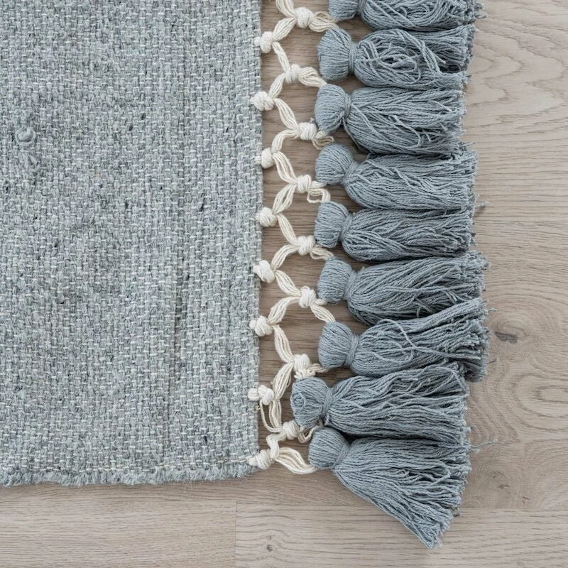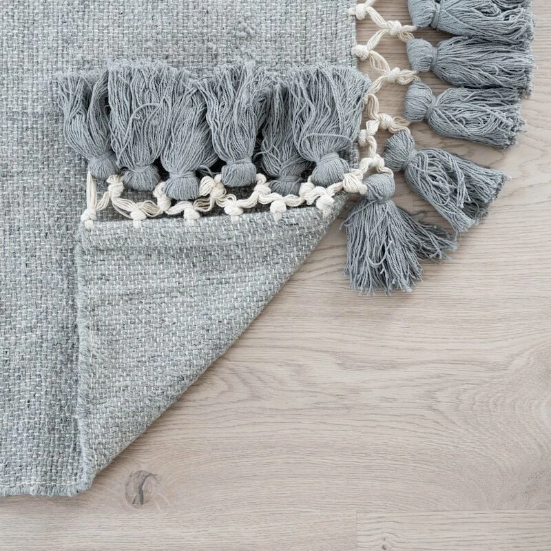 Fanni K Tunne villamatossa on kaunis meleerattu harmaa pinta ja sen juju piilee näyttävissä päätyhapsuissa. Tunne on käsinkudottu, kestävä sekä helposti puhdistettava matto, sillä villa materiaalina hylkii likaa.