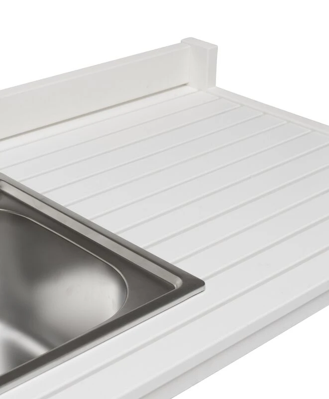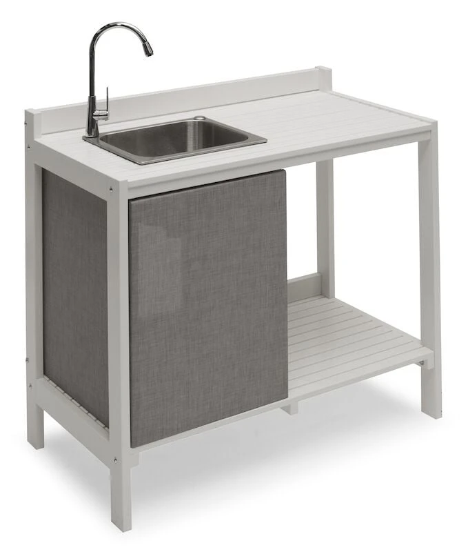 Allas ja hana ovat ruostumatonta terästä. Altaan alle tekstile-kankaasta valmistetun näkösuojan taakse voi sijoittaa astian, jonne vesi valuu. Altaaseen voi liittää myös viemärin (viemäriosat eivät sisällyt toimitukseen). Tämä laadukas kesäkeittiö on valmistettu valkoiseksi maalatusta männystä. Mukana tulee liitin puutarhaletkun kytkemiseksi hanaan.