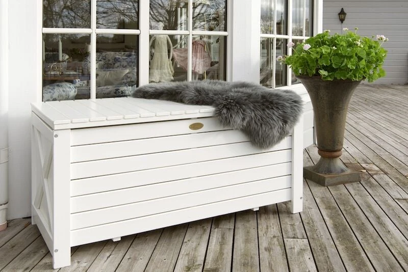 Ajaton ja klassisen kaunis Hillerstorp Läckö pehmustelaatikko. Materiaalina on FSC-merkittyä männyn sydänpuuta, joka on kuultomaalattu valkoiseksi. Pehmustelaatikkoon saa kätevästi pehmusteet säältä suojaan.