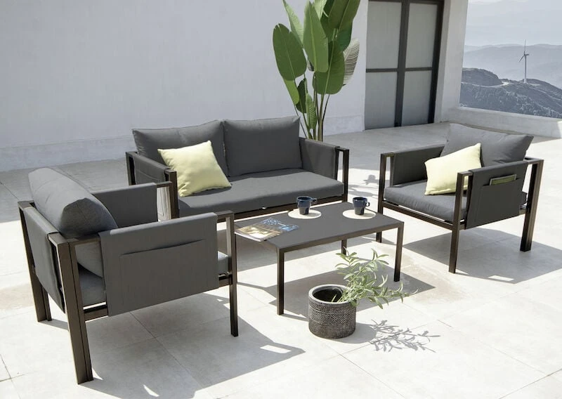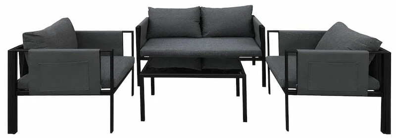 House Nordic Nice sohvaryhmään kuuluu tyylikäs 2-istuttava sohva, kaksi nojatuolia ja sohvapöytä. Sohvapöydän kansi on lasia. Sohva ja nojatuolit on tyylikkäästi muotoiltu ja mukana tulee tummanpuhuvat 100% polyesteriset pehmusteet. Käsinojissa on ihanat taskut lehdille, ihanaa pientä luksusta kesän hetkiin! Pehmusteet on polyesteriä ja kalusteiden rungot terästä. Mukana tulee kasausohje, jonka avulla ryhmä on helppo kasata.
