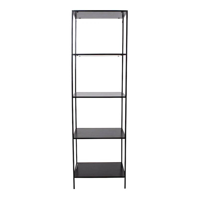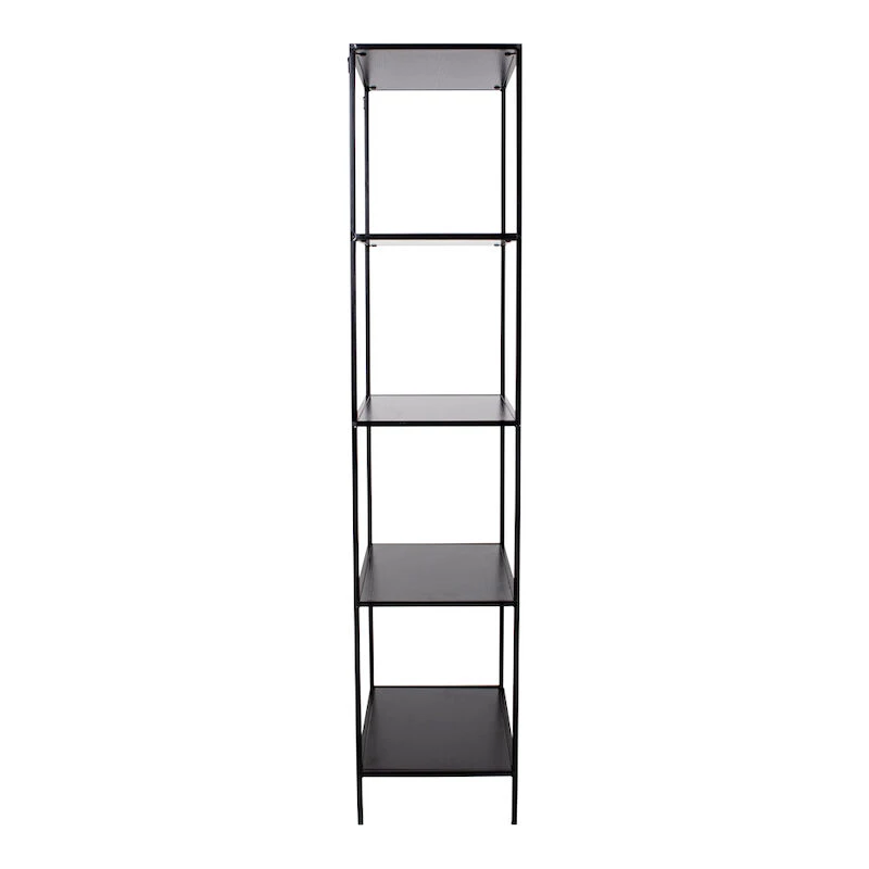 Ilmava ja kapea musta avohylly monipuoliseen sisustamiseen ja säilytykseen. Avohyllyssä on 5 kiinteää hyllyä. Hyllyjen kantavuus on noin 7-10 kg/hylly. Musta, metallista valmistettu runko ja hyllylevyt MDF-levyä.