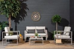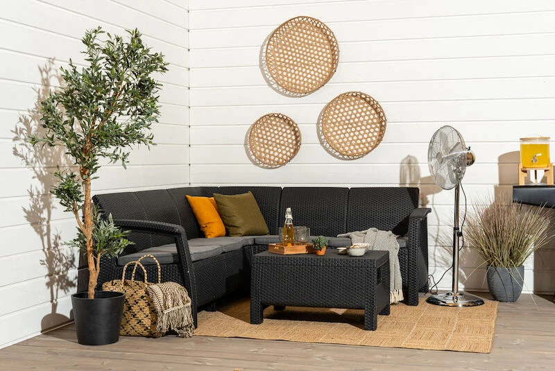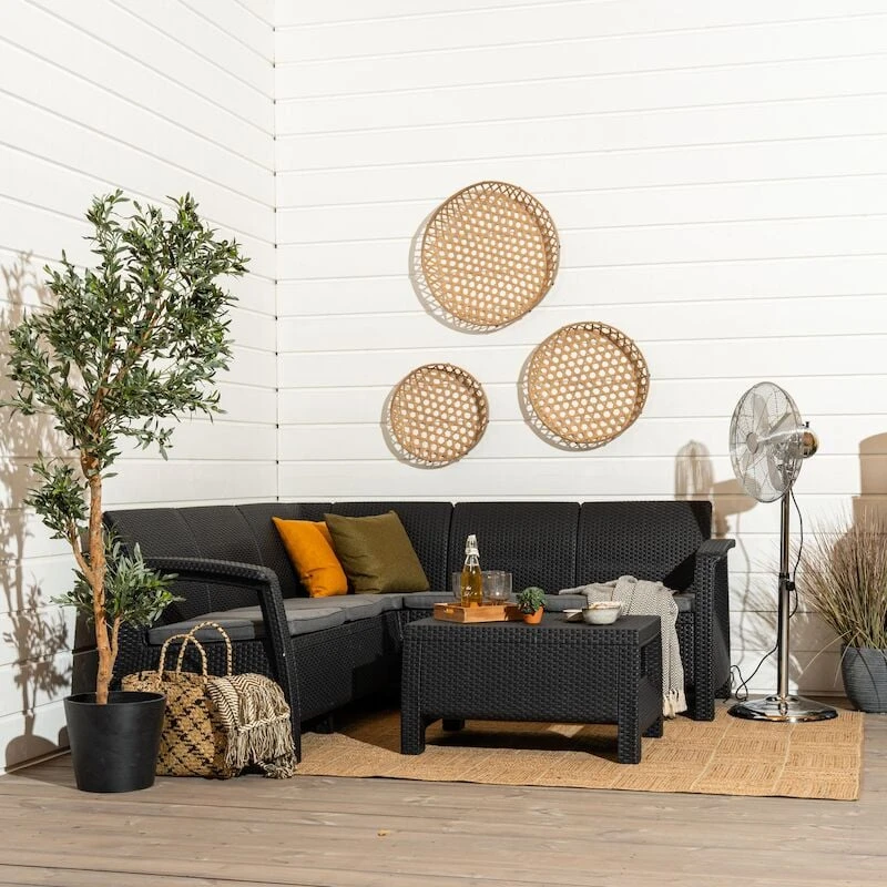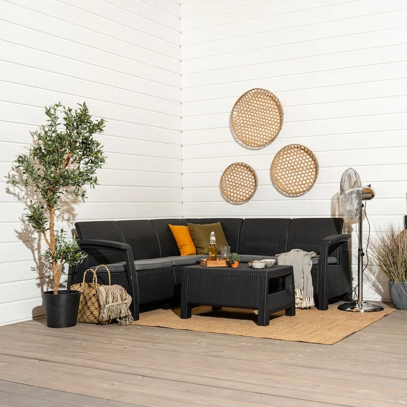 Tyylikäs Corfu kulmasohvasetti on näyttävä kokonaisuus terassille. Ergonomisesti suunniteltuun ryhmään kuuluu kulmasohva ja sohvapöytä. Ryhmä on valmistettu UV-suojatusta kestomuovista. Sohvaa pehmustaa istuintyynyt, joissa on irrotettavat päälliset. Ryhmä on huoltovapaa, kevyt käsitellä ja helppo koota.