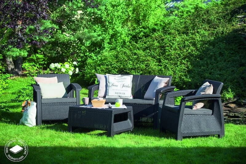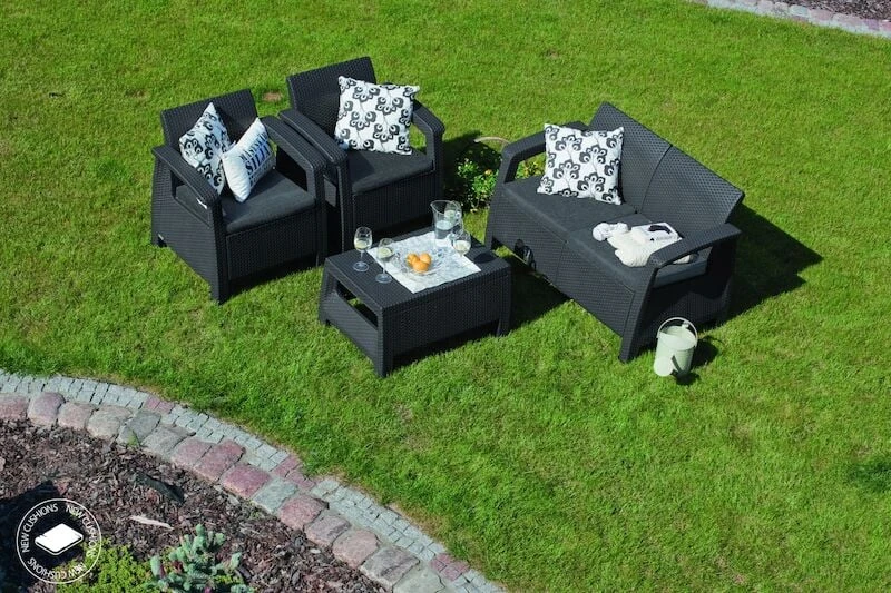 Tyylikäs, ergonomisesti muotoiltu Corfu sohvaryhmä. Ryhmään kuuluu sohva, kaksi nojatuolia ja sohvapöytä. Rottinkimainen rakenne antaa ryhmälle kepeän ilmeen. Valmistettu UV-suojatusta muovista, joka on helppohoitoinen ja säänkestävä materiaali. Istuintyynyt sisältyy mukaan. Pehmusteet on hyvä säilyttää sateelta suojassa.