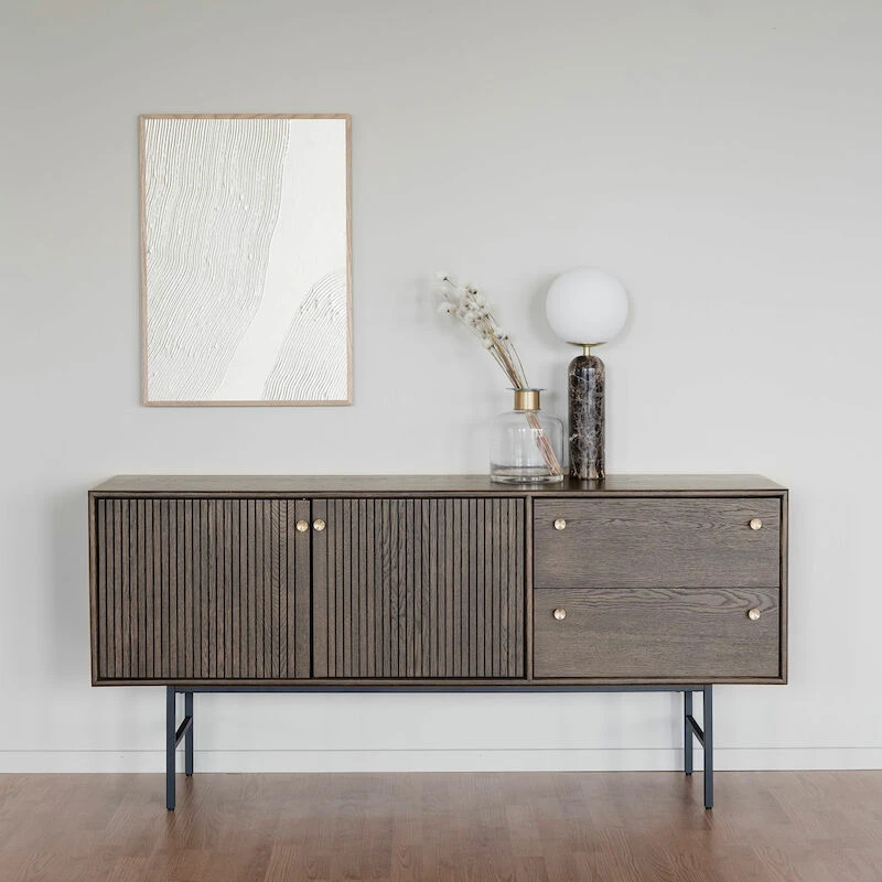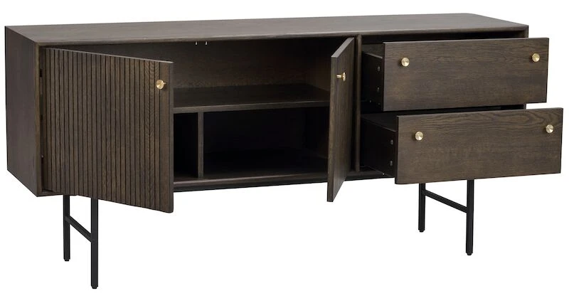 Upea Rowico Clearbrook senkki. Senkissä on metallijalat, senkkiosa on tammiviilua, sävyssä ruskea tammi. Uritetut ovet ovat kaunis yksityiskohta ja personoivat kalustetta. Ruskea sävy ja messinkiset nupit antavat senkille arvokkaan ilmeen. Senkki sopii sijoitettavaksi esimerkiksi olohuoneeseen tai makuuhuoneeseen.