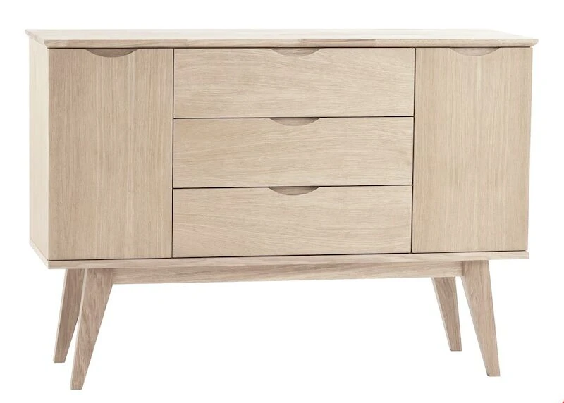 Laadukas ja tyylikkäästi muotoiltu Filippa senkki. Materiaali viilutettua kalustelevyä ja tammea. Senkin leveys on 122 cm, siinä on kaksi ovellista kaappia ja keskellä kolme laatikkoa, senkki sisältää siis hyvin säilytystilaa. Korkeat, viistomaiset jalat keventävät ilmettä ja helpottavat siivousta.