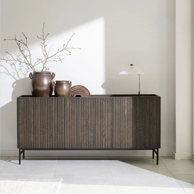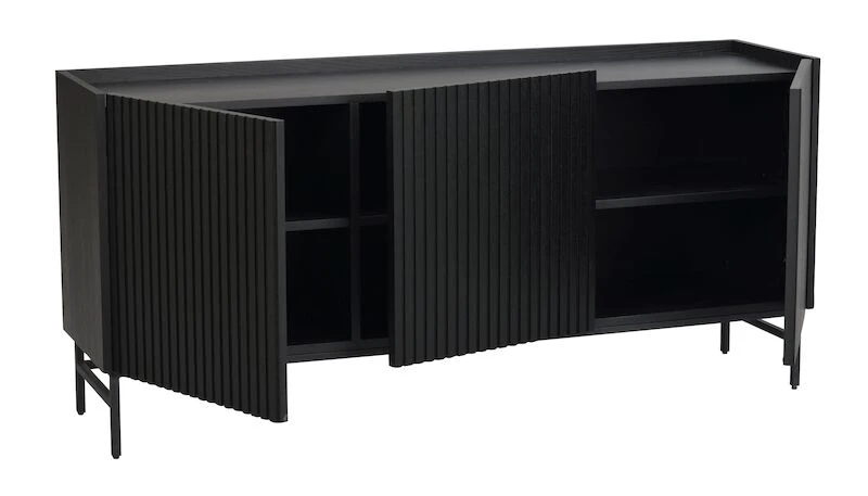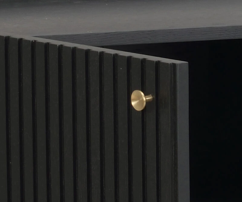 Tyylikäs senkki uritetuilla ovilla ja korkeilla jaloilla. Ovien pystyurat ja hieman upotettu kansi tekevät senkistä tyylikkään, korkeat jalat tuovat ilmavuutta. Mukana tulee kullanväriset nuppivetimet, mutta ovet voi avata myös ilman vetimiä. Kaappiin sopii mukavasti säilytettävää tavaraa, astioita tai kirjoja.