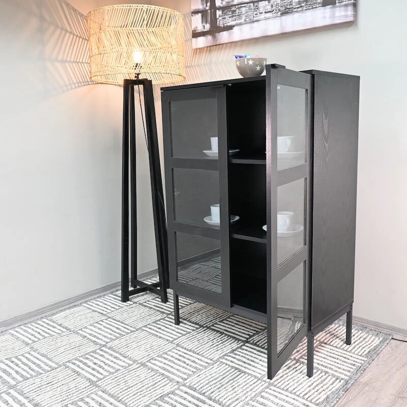 Siera on tyylikkään ja elegantin omaava kalustesarja. Tämä korkea lasiovinen vitriini pitää sisällään kaksi kiinteää hyllyä. Vitriini on kaunis valinta olohuoneeseen tai keittiöön, jossa kaipaat lisää säilytystilaa kauniille esineille. Suosittu musta väri yhdistettynä metallisen kahvan yksityiskohtaan luo täydellisen kokonaisuuden. Materiaali pinnoitettua MDF-Levyä, mustaksi maalattu metallinen kehäjalka ja tyylikäs musta metallinen vedin. Sopii loistavasti moderniin sisustukseen, johon halutaan tyylikästä tummaa ilmettä. Vitriini suositellaan kiinnittämään seinään, kiinnitystarvikkeet tähän kuuluvat pakkaukseen.