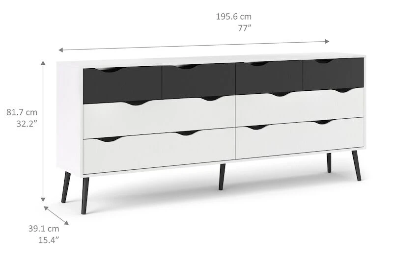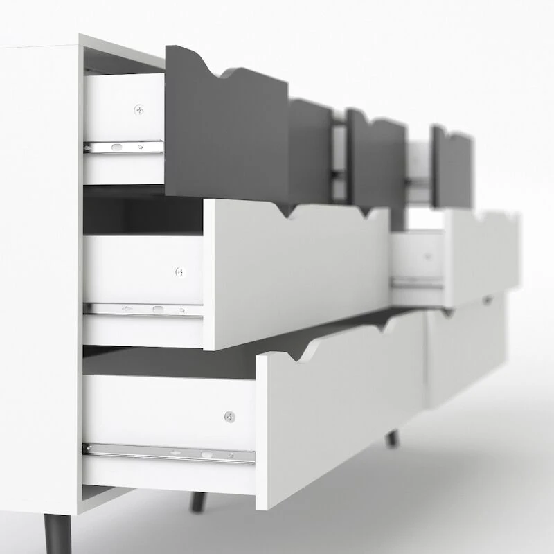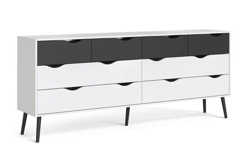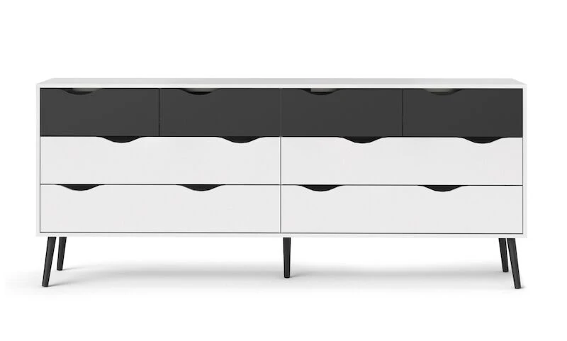 Kaunis Delta senkki runsaalla säilytystilalla. Materiaalina valkoinen kalustelevy. Korkeat tammijalat, värinä musta tai tammi. Senkissä on yhteensä kahdeksan laatikkoa, neljä kapeaa ja neljä leveämpää laatikkoa. Neljä ylintä laatikkoa on valittavissa joko mustan tai tammen värisellä etuosalla. Monikäyttöisen senkin voi sijoittaa kodin useisiin eri tiloihin.
