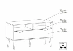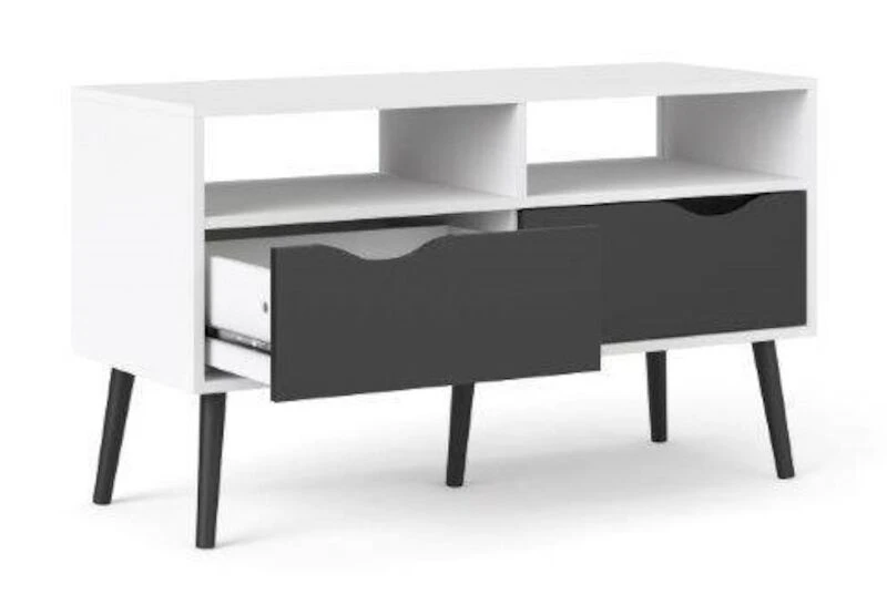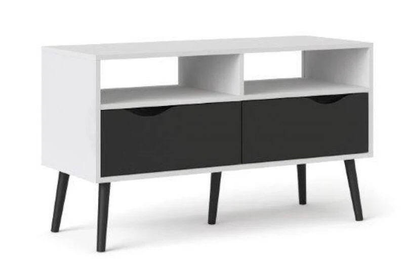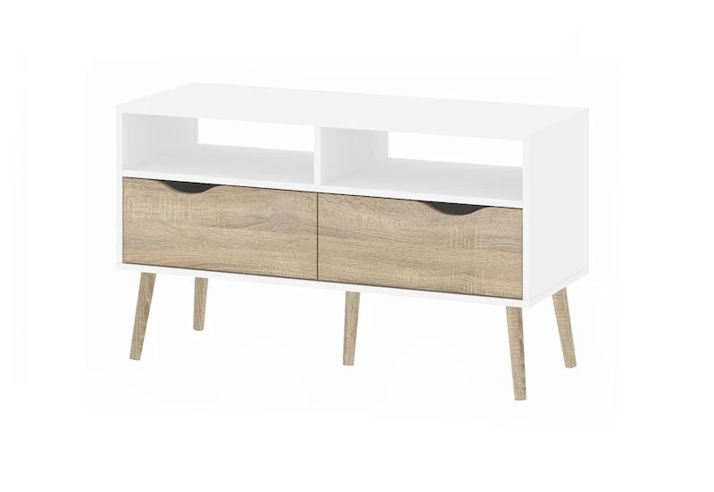 Kaunis ja ajaton Delta tv-taso. Materiaalina valkoinen kalustelevy. Korkeat tammijalat, värinä musta tai tammi. Tv-tasossa on kaksi avohyllyä ja kaksi laatikkoa. Laatikot on valittavissa joko mustan tai tammen värisellä etuosalla. Tv-tason leveys on 100 cm. TV:n suositeltu maksimikoko 39″.