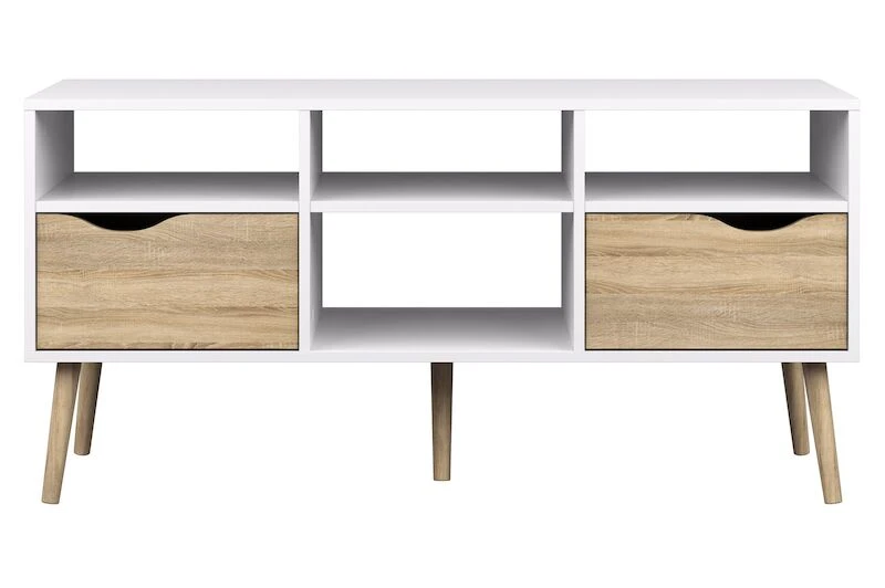 Kaunis Delta tv-taso. Materiaalina valkoinen kalustelevy. Korkeat tammijalat, värinä musta tai tammi. Tv-tasossa on neljä avohyllyä ja kaksi laatikkoa. Laatikot on valittavissa joko mustan tai tammen värisellä etuosalla.
