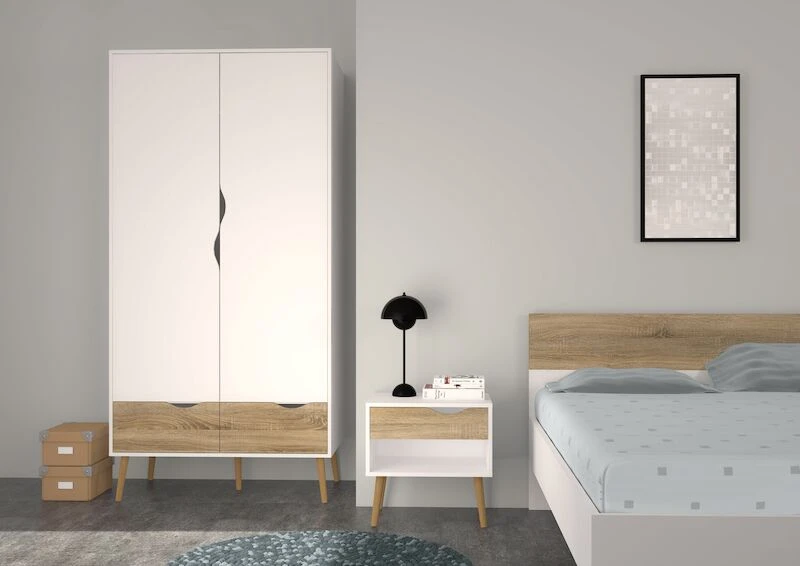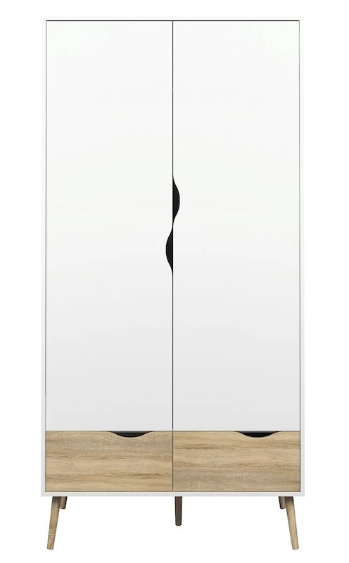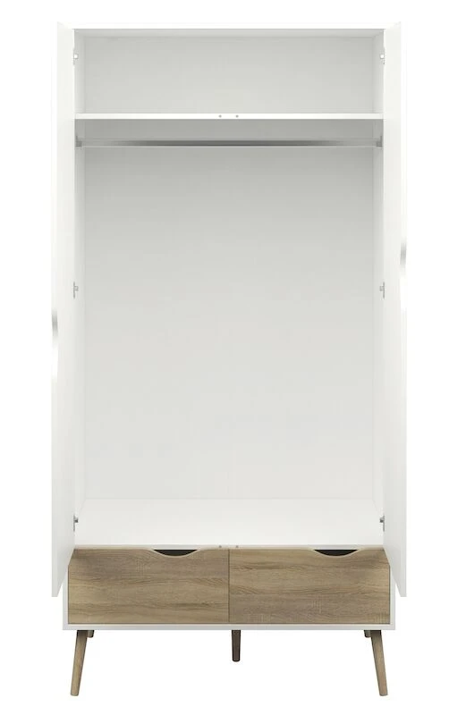 Kaunis ja käytännöllinen Delta vaatekaappi runsaalla säilytystilalla. Materiaalina valkoinen kalustelevy. Korkeat tammijalat, värinä musta tai tammi. Vaatekaapissa on tankotilaa henkarivaatteille, yksi avohylly sekä alhaalla kaksi laatikkoa. Laatikko on valittavissa joko mustan tai tammen värisellä etuosalla. Tuote toimitetaan osina paketissa, kahdessa paketissa.