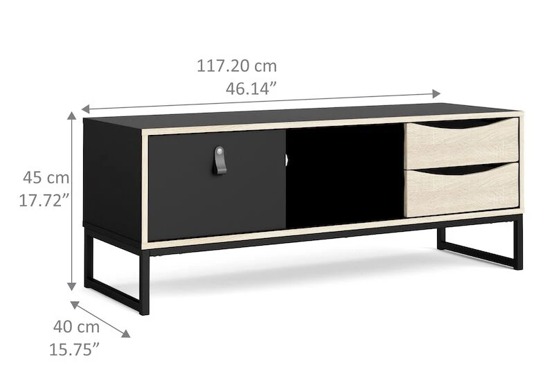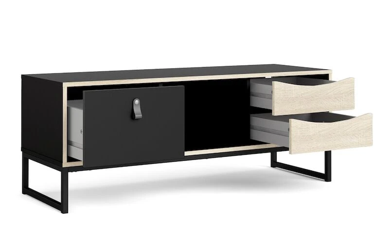 Stubbe tv-taso laatikoilla ja avohyllyllä. Avohyllyn takana on reikä johtoja varten. Tv-tasossa on kaunis yhdistelmä vaaleaa puuta ja mustaa. Nahkainen vedin on kaunis yksityiskohta. Mukana tulee nahkaiset vetimet sekä mustana että ruskeana. Korkeat, metalliset jalat tuovat ilmavuutta ja kepeyttä kokonaisuuteen. Yhdistä saman sarjan senkkiin ja vitriiniin.