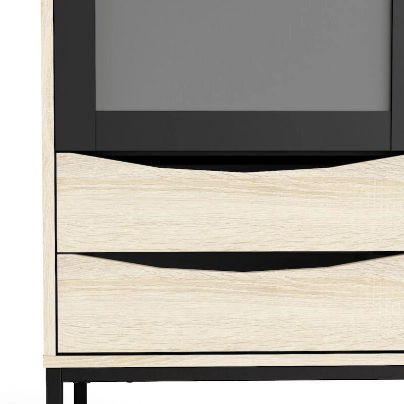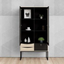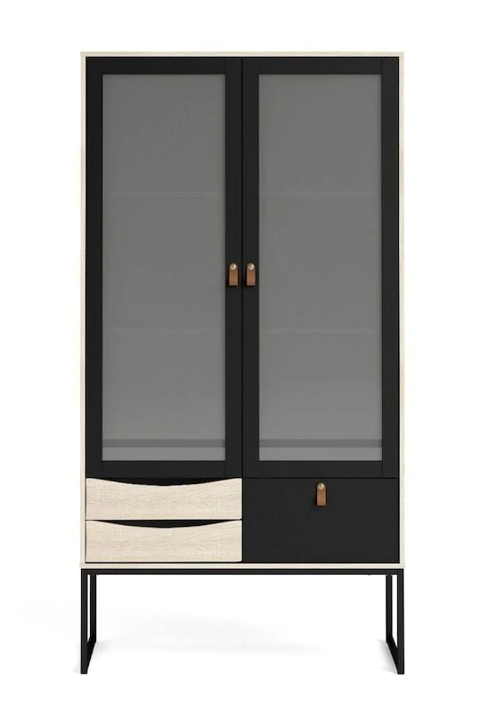 Stubbe vitriini kätkee sisäänsä niin astiastot, maljakot kuin koriste-esineet. Se on kaunis ja käytännöllinen sisustuselementti niin oleskelu- kuin ruokailutilassa. Vitriinissä on kaunis yhdistelmä vaaleaa puuta ja mustaa, nahkaiset vetimet viimeistelevät kokonaisuuden. Mukana tulee nahkaiset vetimet sekä mustana että ruskeana. Vitriinin alaosassa on kolme vetolaatikkoa, joihin saa näppärästi pikkutavaraa katseilta suojaan. Korkeat metallijalat tuovat kookkaaseen vitriiniin kepeyttä ja ilmavuutta. Yhdistä saman sarjan senkkiin ja tv-tasoon. Vitriinin ovien lasit ovat kirkkaat. Ovien takana olevien hyllylevyjen kantavuus on 13 kg/hyllylevy. Pienempien laatikoiden kantavuus on 3 kg/laatikko. Isomman laatikon kantavuus on 6 kg.