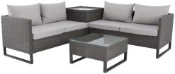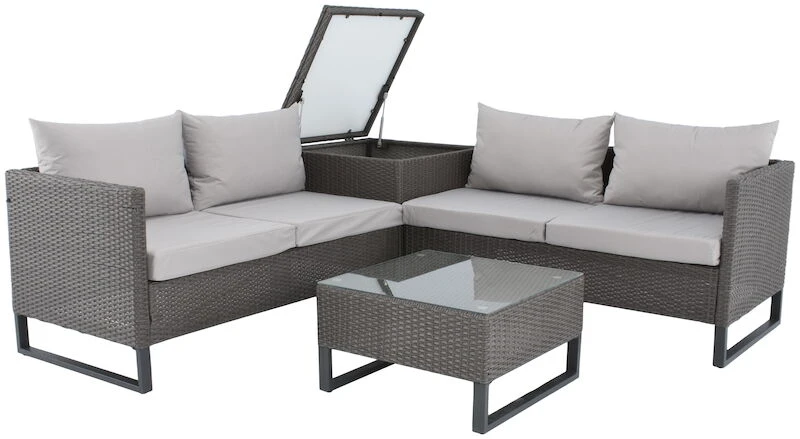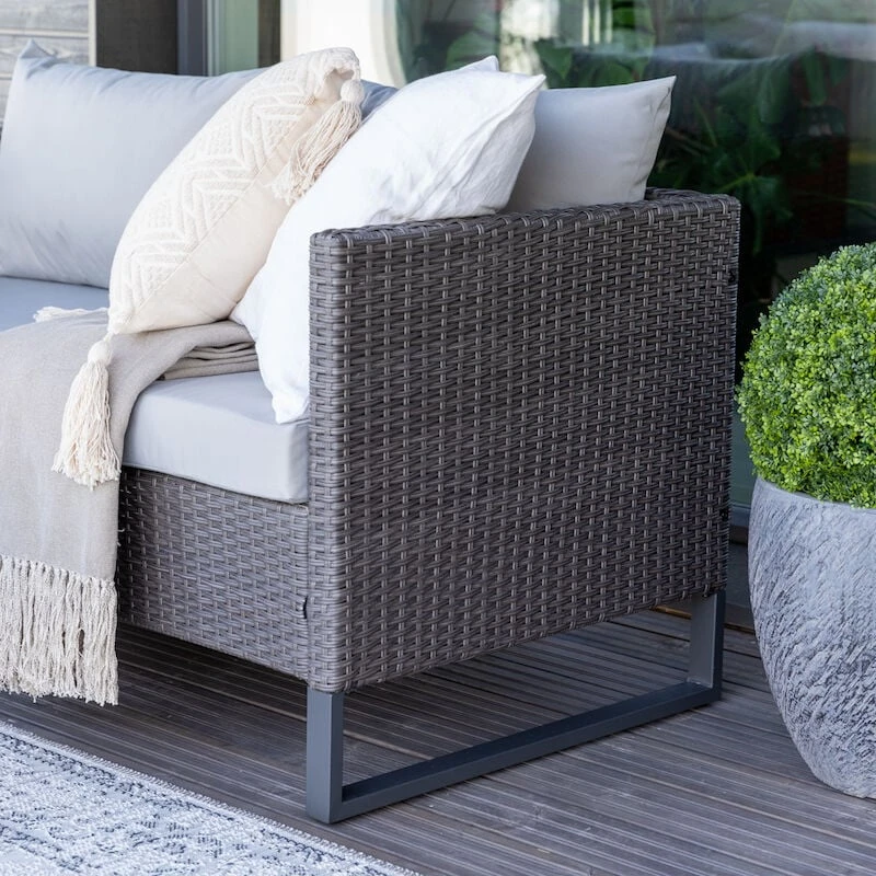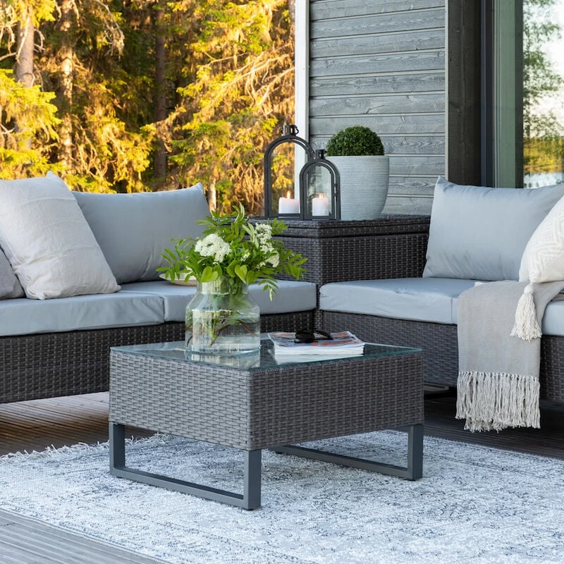 Dublin polyrottinki sohvaryhmä on monipuolinen ja helposti muutettavissa erilaiseksi kokonaisuudeksi. Sohvan moduuleilla voit rakentaa kulmasohvan lisäksi vaikka pitkän 4-hengen sohvan, tällöin sohvan leveys on 338 cm. Tähän pakettiin kuuluu myös sohvapöytä, jonka mitat ovat 61x61x36 cm. Sohvapöydän päällä oleva lasi on karkaistua lasia.