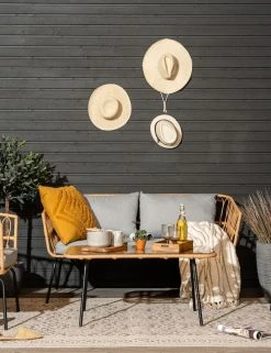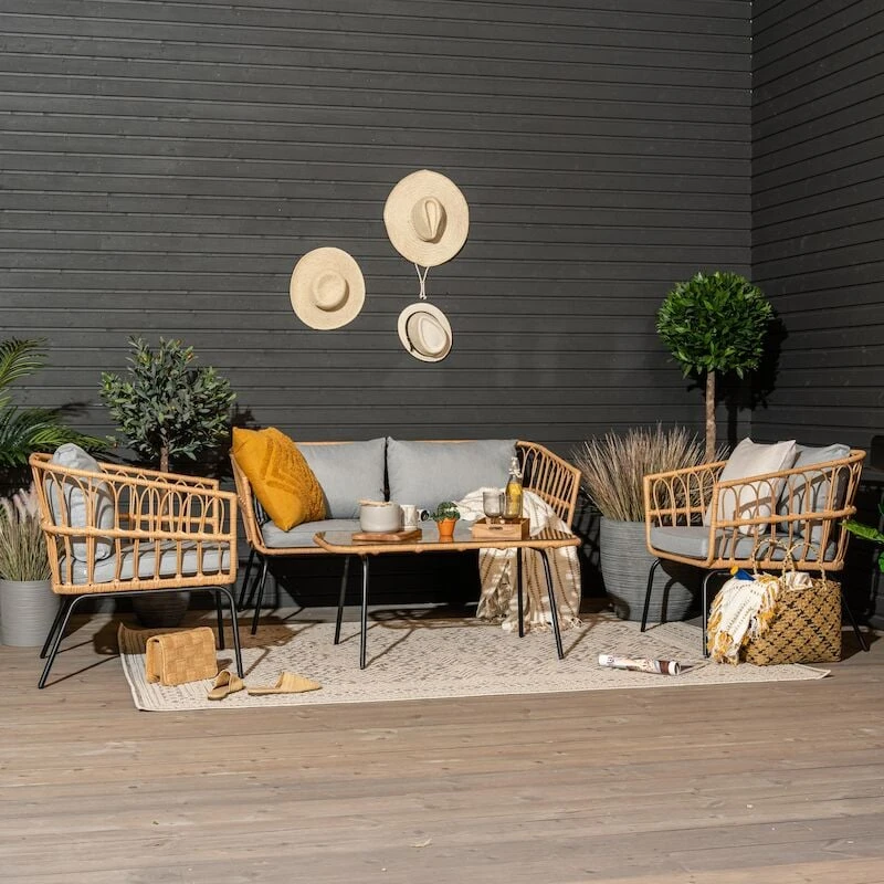 Iisa sohvaryhmä on kaunis yhdistelmä upeasti punottua polyrottinkia ja maalattua metallia. Pöydän kansi on lasia. Ihanat pehmusteet tuovat lisämukavuutta oleskeluun. Pehmusteiden päälliset ovat 100% polyesteriä. Hanki lisäksi sohvaryhmälle torkkupeittoja ja voit nauttia illoista pitkään. Sohvan istuinleveys 120 cm ja nojatuolin 49 cm.