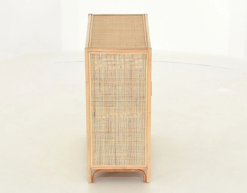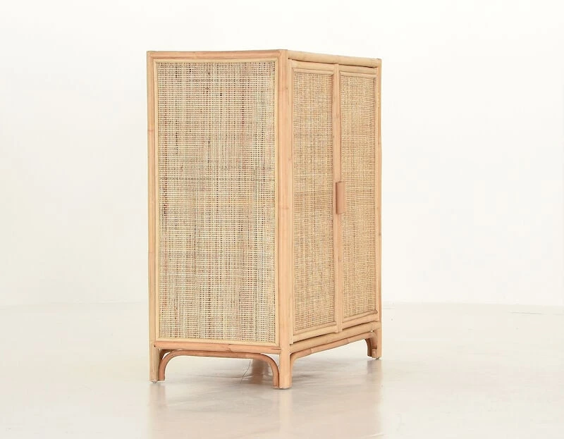 Kaunis, luonnonläheinen Juuri rottinkikaappi kahdella ovella. Kaapin runko on puolikiillotettua rottinkia ja ovet sekä molemmat sivut rottinkipunosta. Kaapin sisällä on yksi kiinteä hylly.