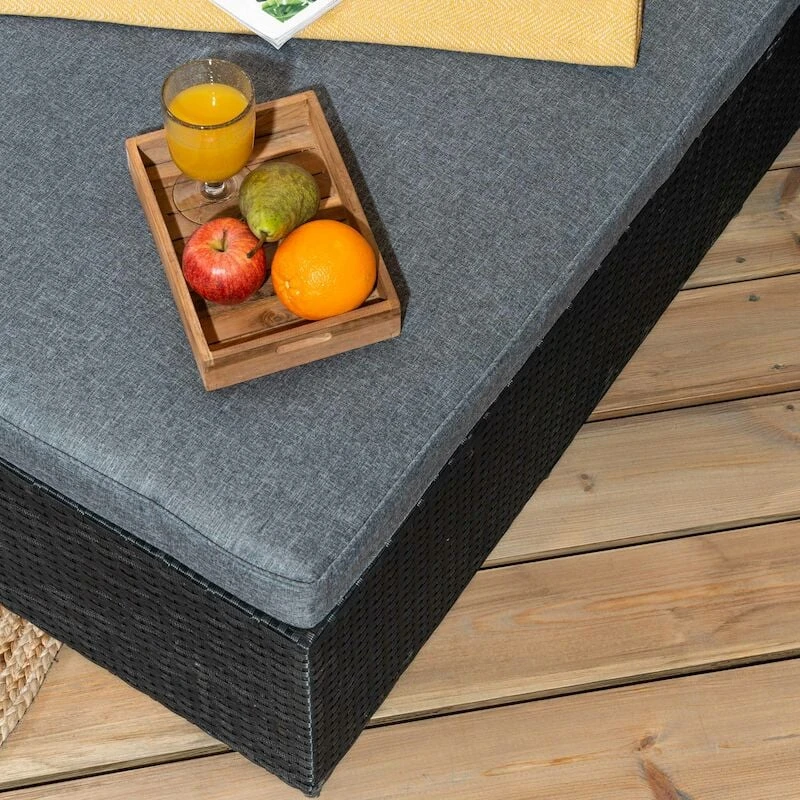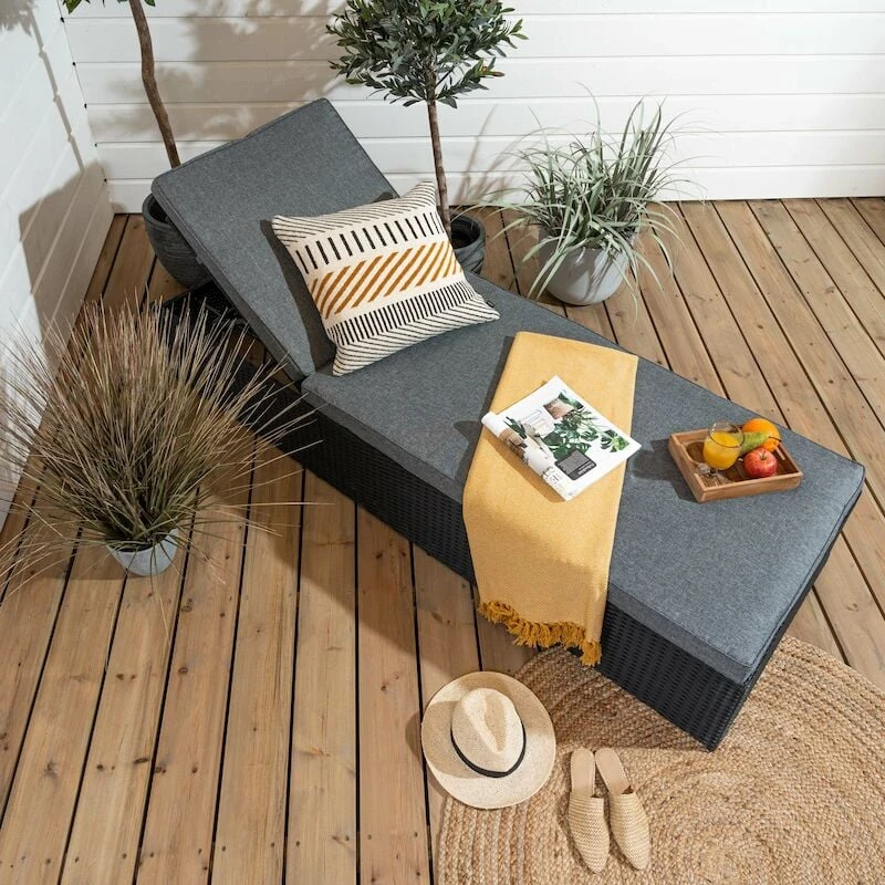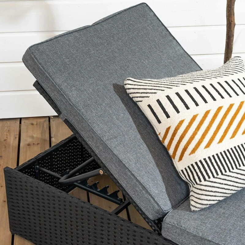 Aurinkoisita kesäpäivistä on mukava nautiskella lepoasennossa aurinkotuolin päällä. Kalla on helposti säädettävä aurinkotuoli, jonka selkänoja on säädettävissä viiteen eri asentoon. Mukaan kuuluu 9 cm paksu istuinpehmuste. Kalla aurinkotuolin runko on valmistettu tukevasta teräksestä ja teräksen päälle on punottu huoltovapaa UV-suojattu polyrottinki. Tuote toimitetaan valmiiksi kasattuna.