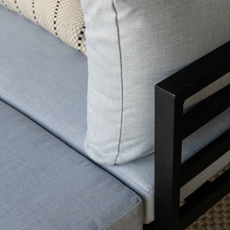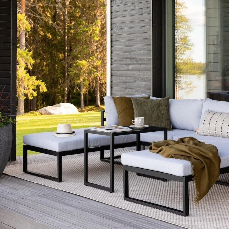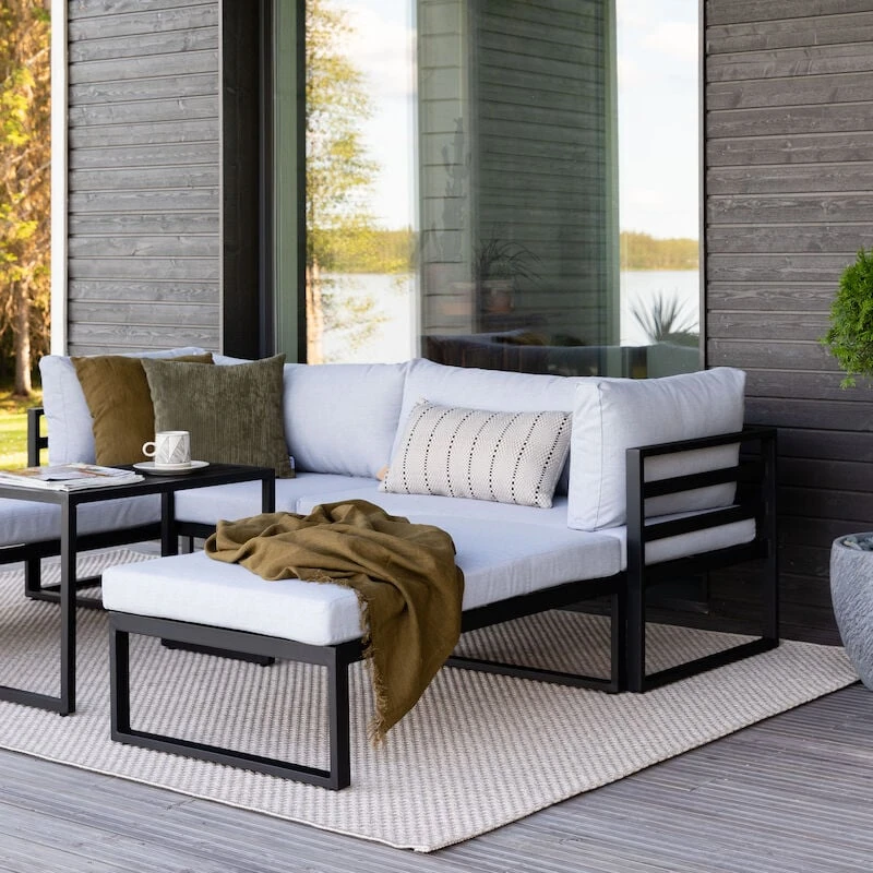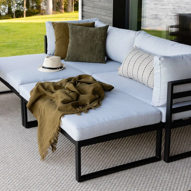 Kallio sohvaryhmä on yksinkertaisen tyylikäs ja kaunis, todella viehättävä ulkosohvaryhmä. Tämän sohvaryhmän kehtaa laittaa niin terassille, kuin vaikka paviljongille. Ryhmän käyttömahdollisuudet ovat monipuoliset sillä kulmapalat, rahit ja pöytä ovat liikuteltavissa. Sohvaryhmän tyynyjen päälliset ovat 100% polyesteriä, ne ovat irrotettavissa ja pestävissä. Runko on jauhemaalattua alumiinia, joten ryhmää on helppo siirrellä sen keveyden vuoksi. Tuote toimitetaan muutoin valmiiksi kasattuna, mutta se täytyy toki asetella ja laittaa tyynyt paikoilleen. Kuvassa näkyvässä asetelmassa divaanin istuinsyvyys on 150 cm. Rahin mitat 65×106 cm.