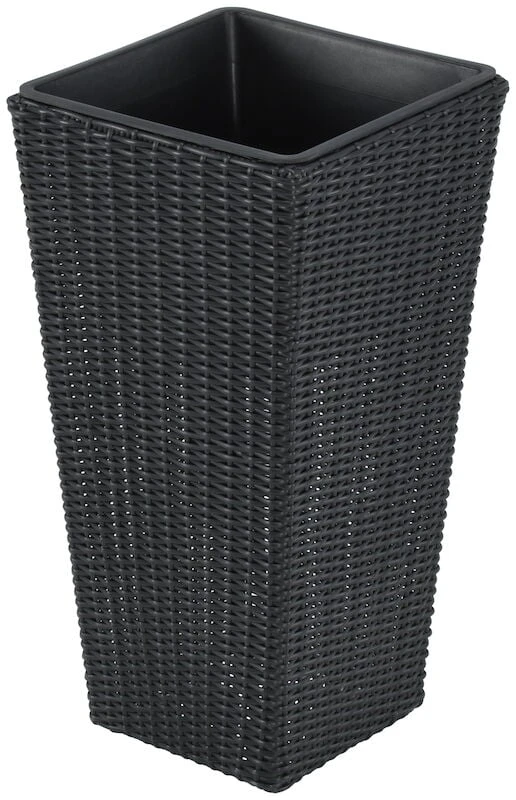 Ulkokäyttöön sopiva Kartio polyrottinki kukkaruukku. Runko on metallia, punos UV-suojattua polyrottinkia ja istutusastia muovia. Varsinaisen kukkaruukun sisällä on muovinen istutusastia, joka ei ole niin syvä kuin kukkaruukku itse. Tämä helpottaa kukkien istutusta. Korkeisiin ruukkuihin saat tehtyä näyttävät kukka-asetelmat, jotka sijoitat esimerkiksi ulko-ovelle vieraita ilahduttamaan. Muovisen istutusastian sisämitat: Leveys 22 cm, syvyys 22 cm ja korkeus 26 cm. Ruukkua voi säilyttää talvisin ulkona, mutta sen pitää olla tyhjä tai se voi jäätyessään haljeta.