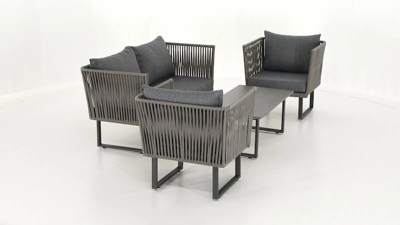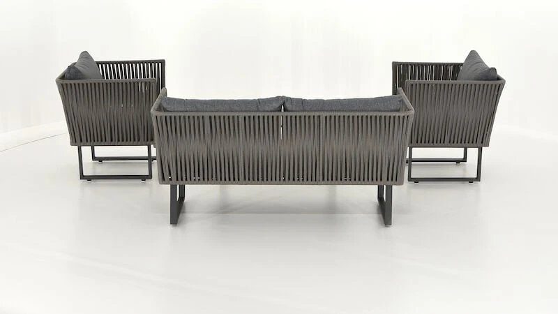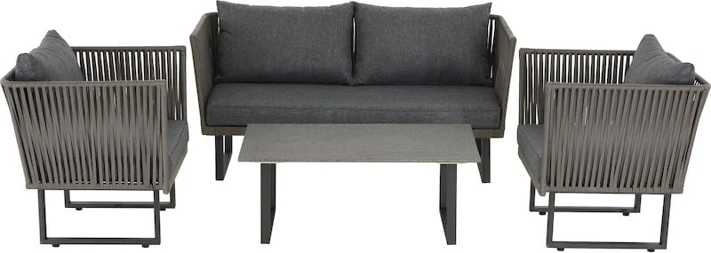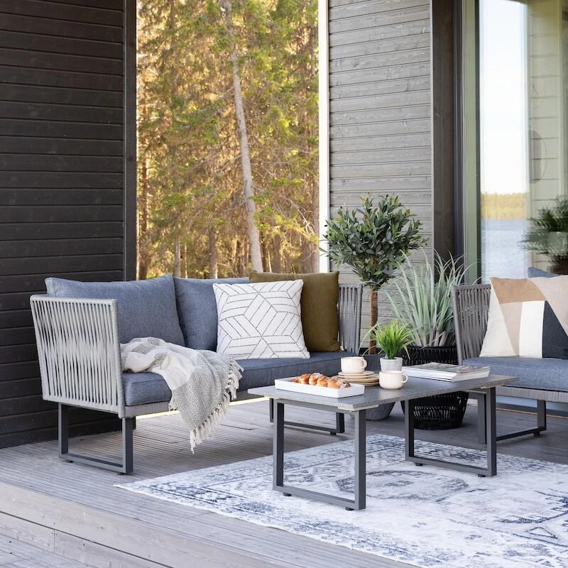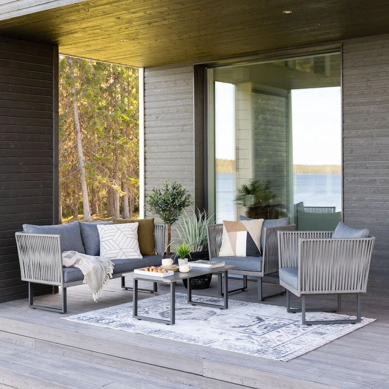 Kataja sohvaryhmässä on kaikki tarpeellinen katetun terassin sisustamiseen. Ryhmä koostuu sohvasta , kahdesta nojatuolista ja pöydästä. Runkomateriaali on jauhemaalattua terästä. Tuolin punokset ovat 12mm vahvaa pajuköyttä. Pöydän kansi sementtikuitua. Väri rauhallinen harmaa. Sohvan istuinleveys 139 cm, istuinsyvyys 56 cm ja istuinkorkeus 41 cm. Nojatuolin istuinleveys 60 cm, istuinsyvyys 56 cm ja istuinkorkeus 41 cm.