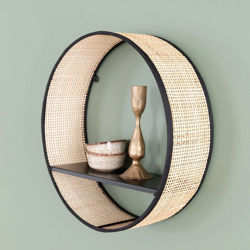 Kerä seinähylly on upea yhdistelmä rottinkia ja mustaksi maalattua metallia. Runko on metallia ja kehys kaunista rottinkia. Hylly kiinnitetään seinään kiinnikkeistä parilla ruuvilla, ruuvit ei tule pakkauksen mukana. Seinähyllyjen avulla saa kotiin helposti säilytystilaa viemättä kulkutilaa.