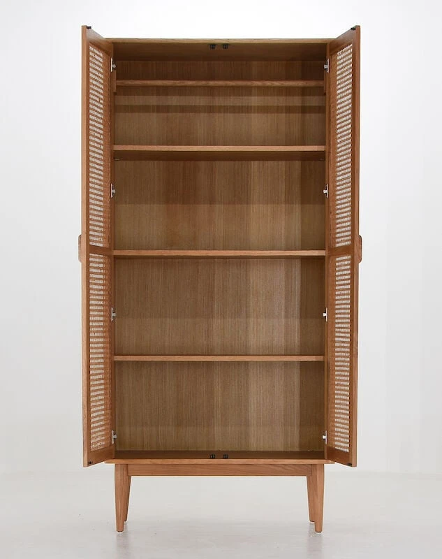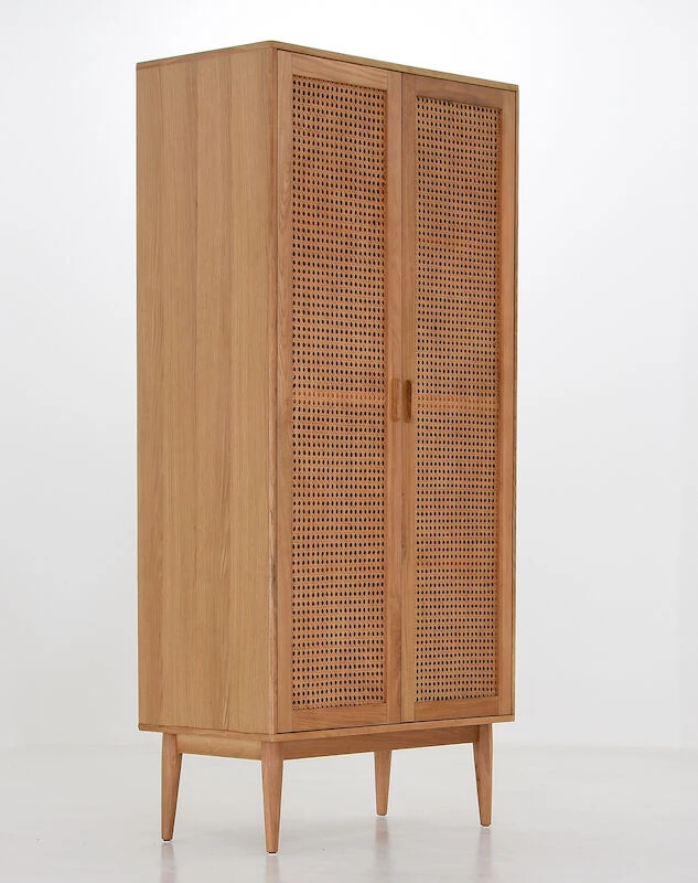 Kielo kaappi sopii niin makuuhuoneeseen kuin muihinkin tiloihin. Kaapissa on runsaasti tilaa ja sen 26 cm jalat keventävät ulkonäköä ja helpottavat siivousta. Runko tammiviilutettua vaneria, ovien kehykset ja jalat tammea, ovissa rottinkipunos. Kaapin sisällä vaatetanko ja 4 hyllyä. Ylin ja alin hyllylevy on irrotettavissa mutta ei säädettävissä. Keskimmäinen hyllylevy on kiinteä.