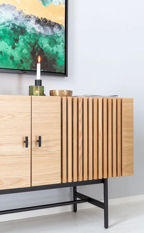Korte tv-taso on kaunis valinta kotiisi. Mustat metallijalat ja vetimet yhdistettynä upean tammen sävyiseen puukuviointiin luo näyttävän ilmeen sisustukseesi. Taso on valmistettu mdf-levystä ja viilutetusta tammesta. Levyn pinta on viilutettua tammea, jossa näkyy kauniisti aito puun kuviointi. Puun kuviointi ja värisävy vaihtelee tuotteittan, eikä kahta täysin samanlaista tuotetta ole. Tason jaloissa on säädettävät mustat nastat, joiden avulla tason voi hienosäätää suoraan. Korkeutta nastojen avulla ei voi juurikaan säätää.