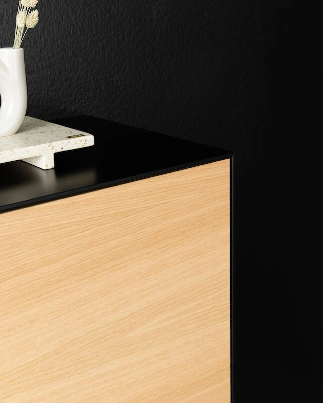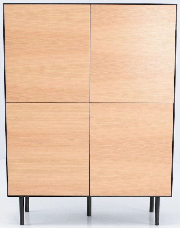Moderni Koto kaappi 4-ovella. Koto kaapissa on neljä erillistä ovea, joiden takana on säädettävät hyllyt. Korkeutta voi säätää kolmeen eri tasoon. Ovissa push-open mekanismi. Tyylikäs mustaksi maalattu runko on MDF-levyä ja ovet aitoa tammiviilua. Tammiviilu on luonnonmateriaali, josta johtuen kuvioinnissa ja sävyssä voi olla eroja. Korkeat mustat metallijalat ovat tyylikkäät ja helpottavat siivousta kaapin alta.