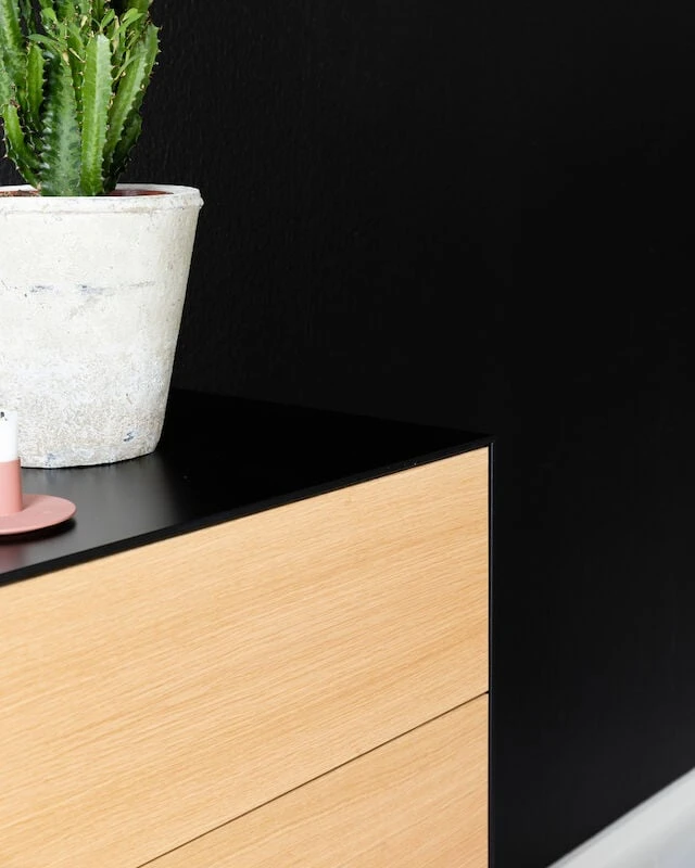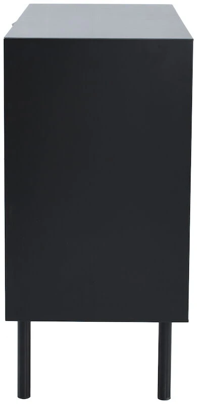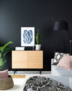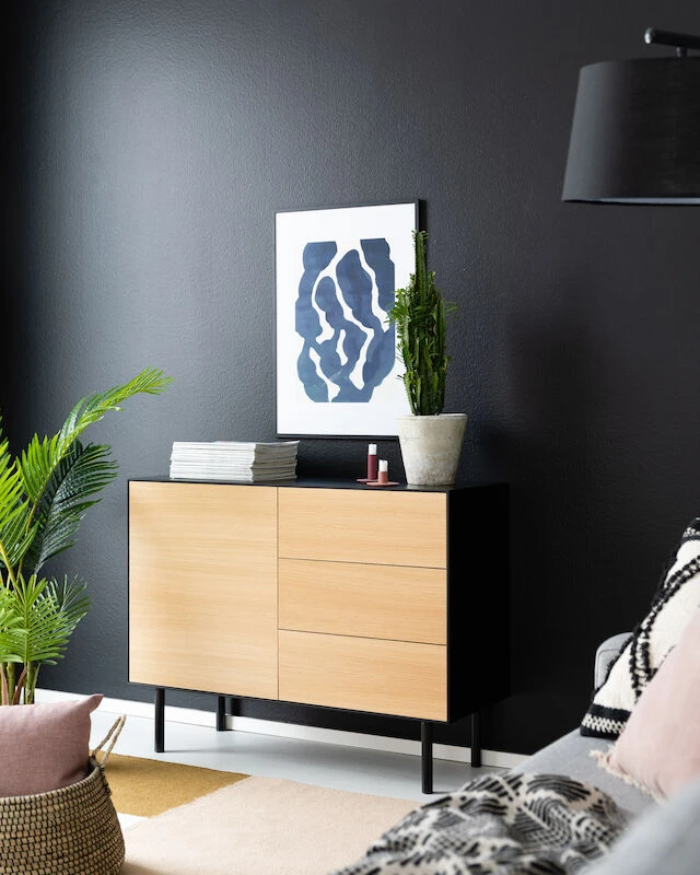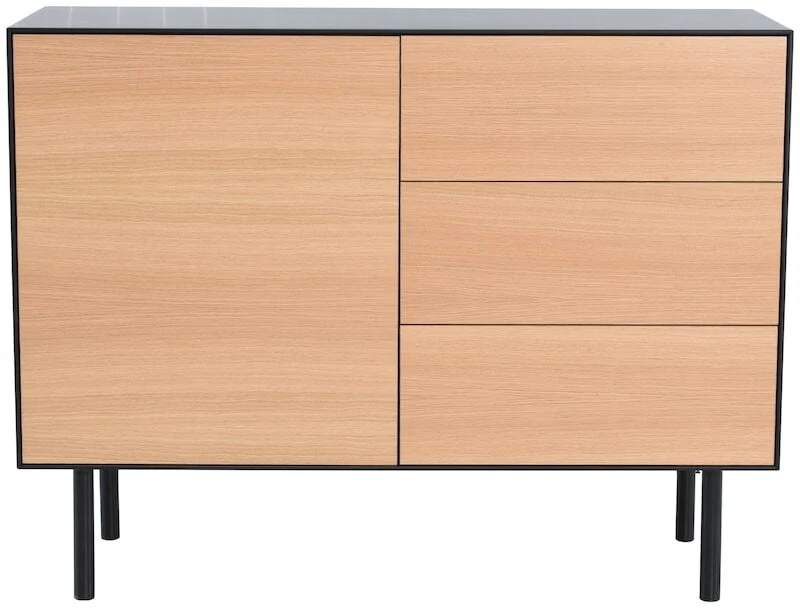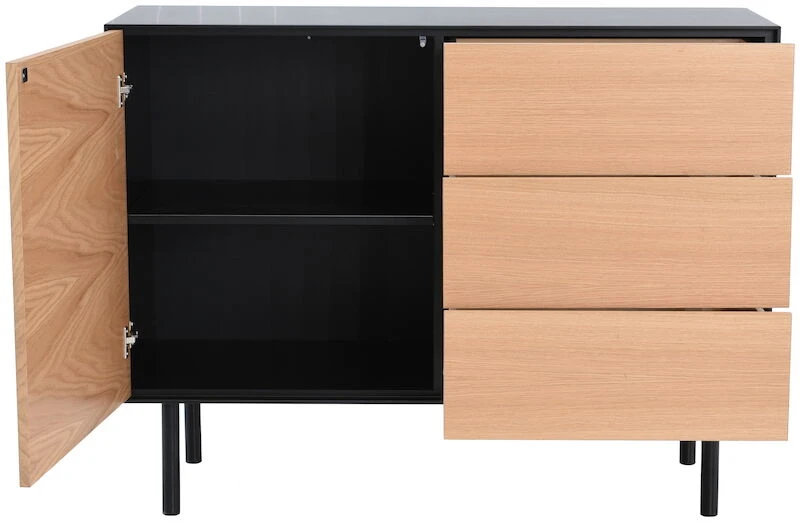 Kaunis ja laadukas Koto senkki 110 cm sopii kodin moniin tiloihin. Senkissä on kolme laatikostoa ja kaappi, jossa hyllyn korkeus on säädettävissä. Senkin runko on mustaksi maalattua MDF-levyä ja ovien ja laatikoiden etulevyt ovat tammiviilua. Tammiviilu on luonnonmateriaali, josta johtuen kuvioinnissa ja sävyssä voi olla eroja. Laatikoissa ja ovissa push-open mekanismi. Senkin korkeat jalat helpottavat siivousta senkin alta. Jalat kiinnitetään ruuveilla runkoon kiinni.