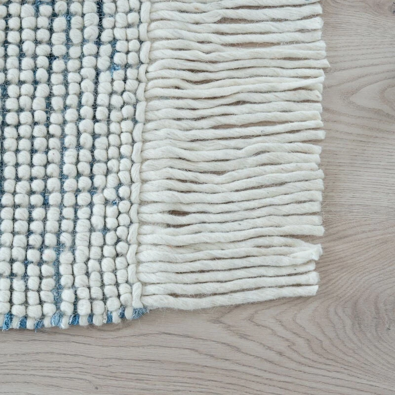 Kuutamo villamatossa on ihana pallomainen kuviointi ompeleiden vuoksi. Matto on Intiassa käsinkudottu ja on mukavan pehmeä jalan alla. Villan ja farkkupuuvillan yhdistelmä on lämmin ja miellyttävä materiaali esim. olohuoneeseen. Matossa hauskat pitkät ja paksut hapsut.