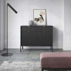 Tyylikkäässä Latte lipastossa on kaksi vetolaatikkoa sekä kaksi kaappia. Kaapeissa on väliseinän molemmin puolin yksi hylly. Lipaston runko on 16 mm paksua laminoitua kalustelevyä, jossa on ABS-reunanauha. Mustat 20 cm korkeat metallijalat tuovat senkille siron, modernin ilmeen. Laatikoiden ja ovien etusarjat ovat 18 mm paksua mdf-levyä ja niissä on harjatut kullanväriset alumiinivetimet. Etusarjoissa tyylin viimeistele näyttävä uritus, joka toistuu kaiksissa tuotteissa.