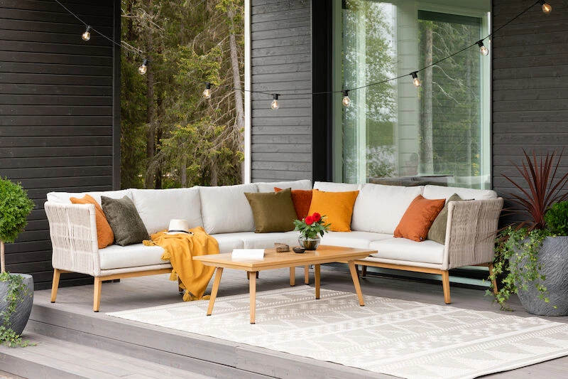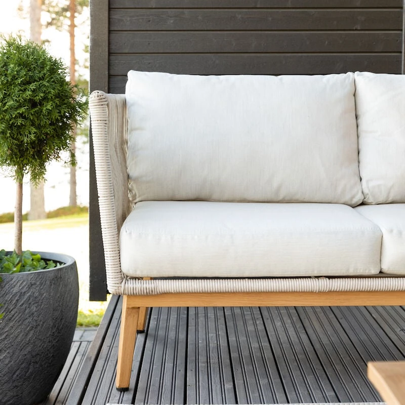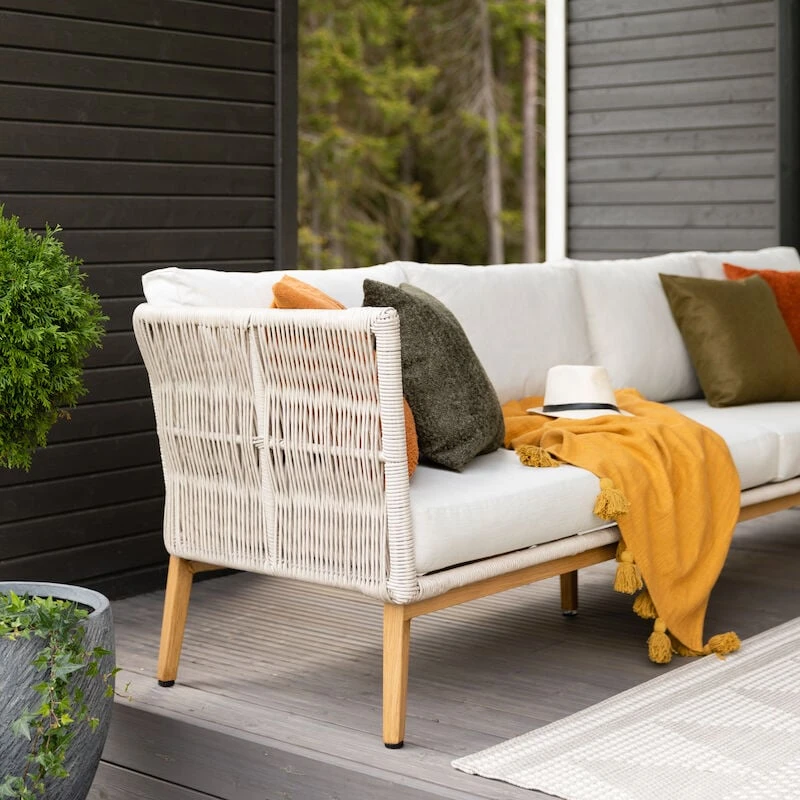 Loiste kulmasohva ja sohvapöytä sopivat täydellisesti kesäterassille. Sohvalla on reilusti tilaa istuskella tai nauttia pötkötellen kesäisistä päivistä. Sohvan istuinosa on hiekan väristä polyrottinkipunosta ja tyylin viimeistelee kaunis puuta jäljittelevä jalkaosa, joka on kestävää alumiinia. Muhkeat istuinpehmusteet tekevät istumisesta miellyttävää. Pehmusteiden päälliset ovat säänkestävää polyester-kangasta ja päälliset ovat irroitettavat. Pehmusteet eivät kuitenkaan ole vedenpitävät, joten ne tulee suojata sateelta. Sohvapöytä on pinnoitettua ruostumatonta alumiinia, jossa on harjattu ja öljytty pinta. Kaunis pinta näyttää puiselta, kuitenkin ilman puukalusteiden huollon tarvetta.
