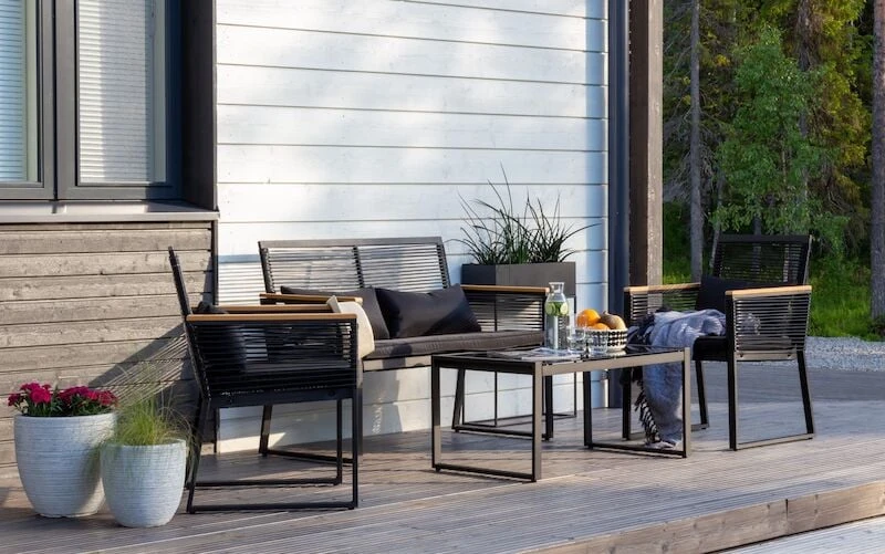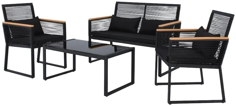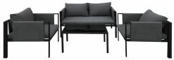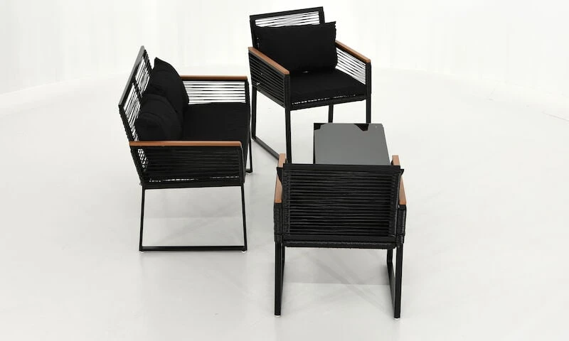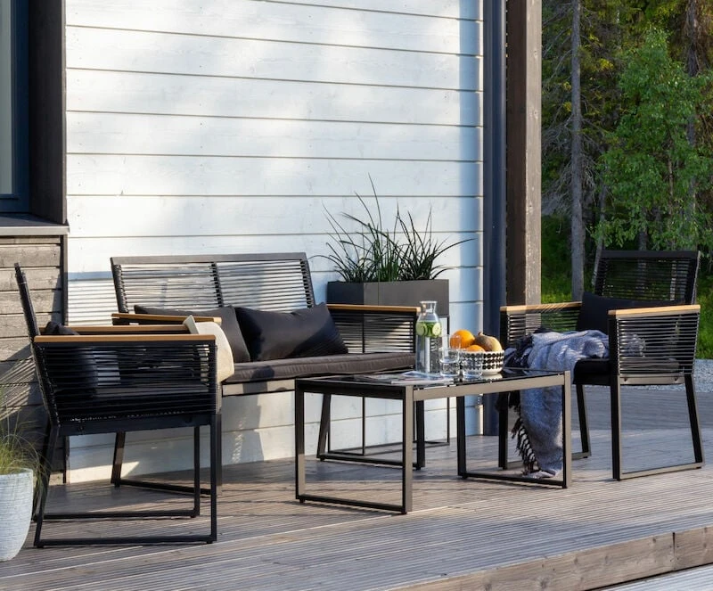 Long sohvaryhmän moderni ja siro muotoilu antavat kivasti ilmavuutta terassille tai parvekkeelle. Tuotteen runko valmistetaan kestävästä ja ruostumattomasta alumiinista, jota ympäröi kaunis ja ilmava säänkestävä polyrottinki. Pehmusteet tulee säilyttää sateelta suojassa. Kangas ei ole uv-suojattu, joten väri voi haalistua suorasta auringonpaisteesta. Sohvan ja tuolien kauniit kädensijat ovat säänkestävää aintwood-puukomposiittia. Long sohvaryhmä sisältää kuvassa näkyvät pehmusteet, sohvan, kaksi nojatuolia ja sohvapöydän. Sisältää myös kuvassa näkyvät pienemmät mustat tyynyt.