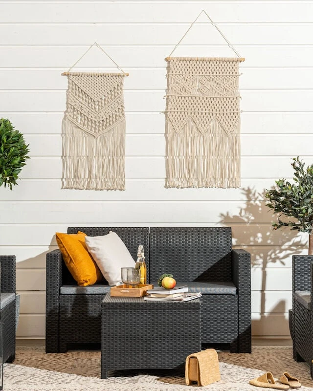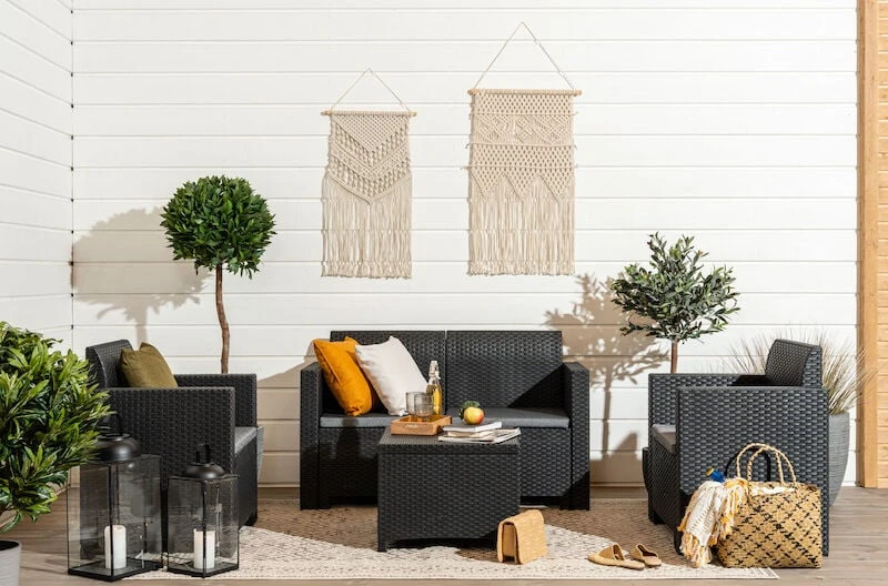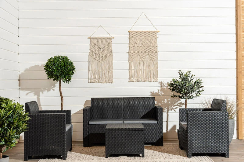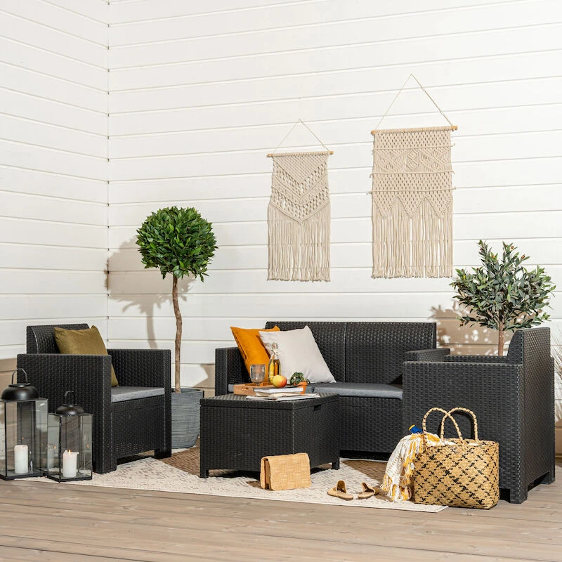 Tyylikäs rottinkinen sohvaryhmä kokonaisuus ulkotilojen oleskeluun. Setti sisältää kaksi nojatuolia, sohvan ja sohvapöydän. Kauniisti muotoillut, ergonomiset selkänojat ja istuintyynyt. Materiaalina helppohoitoinen polyrottinki.